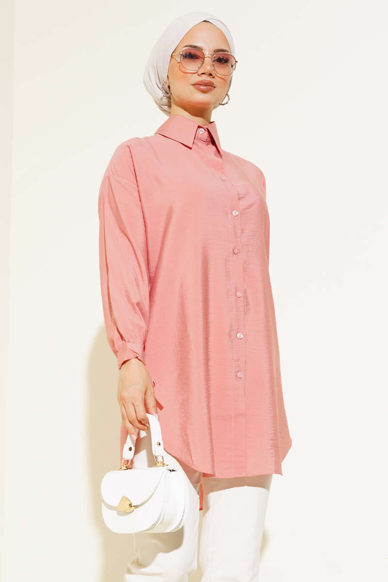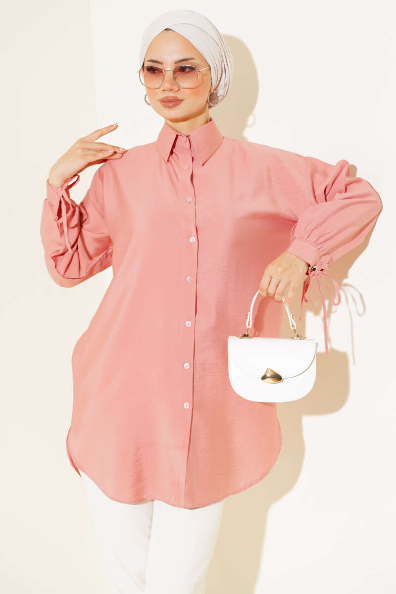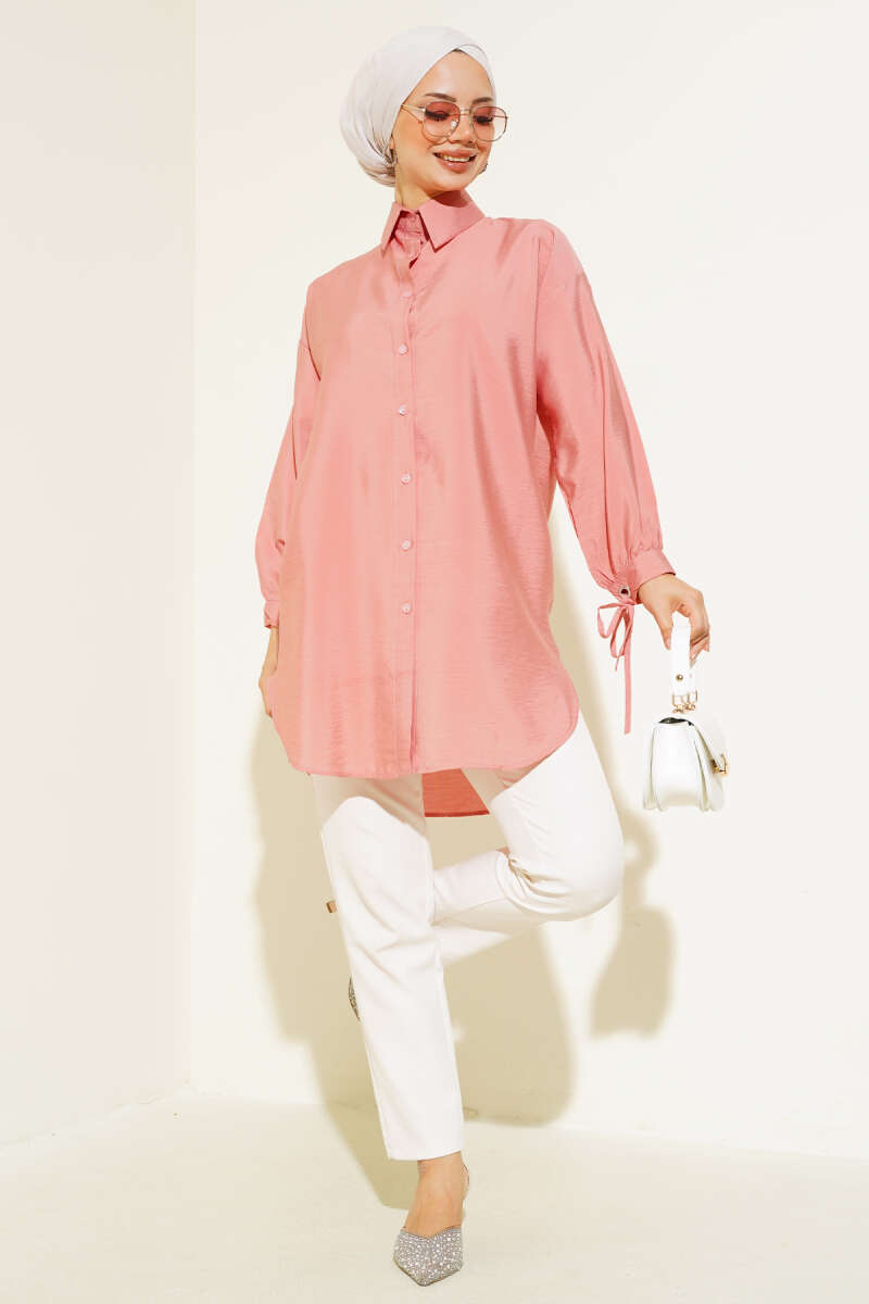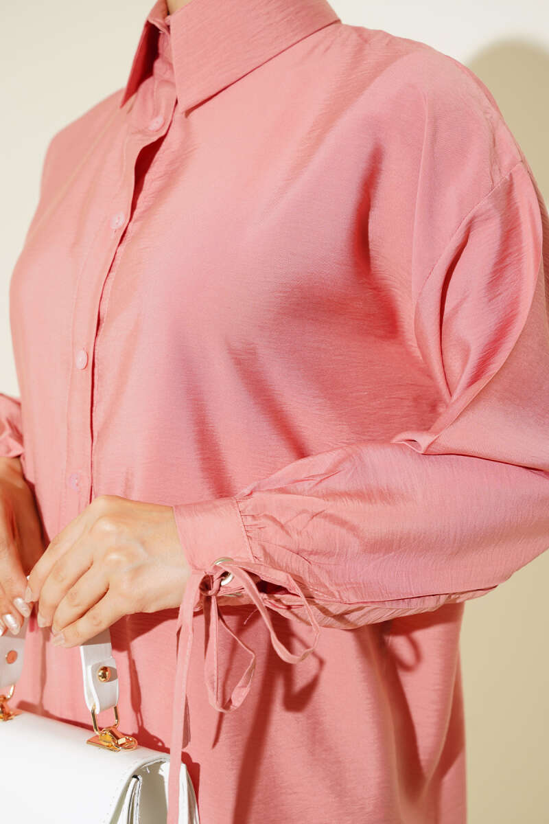 Gizli Düğmeli Bel Kuşaklı Gömlek Pembe