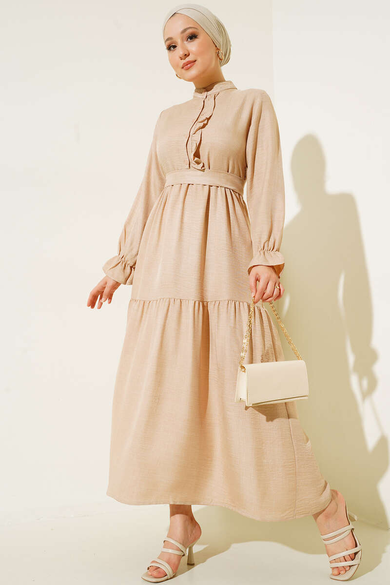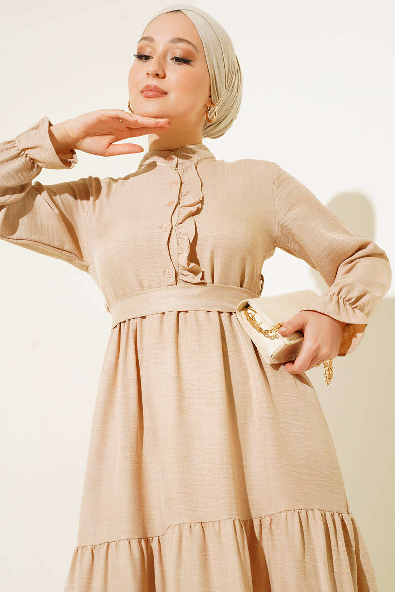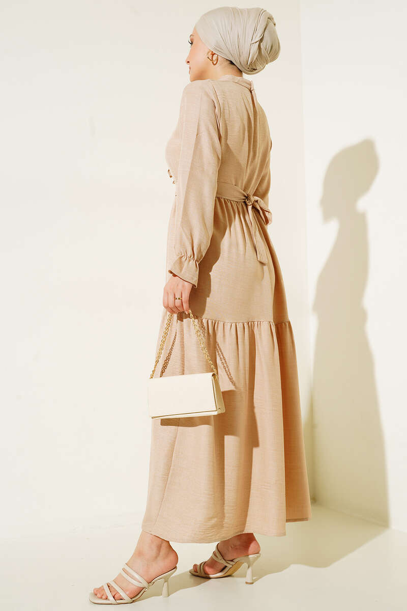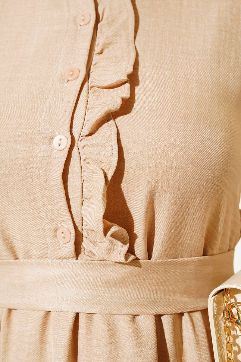 Meloni Keten Hakim Yaka Düğmeli Elbise Bej