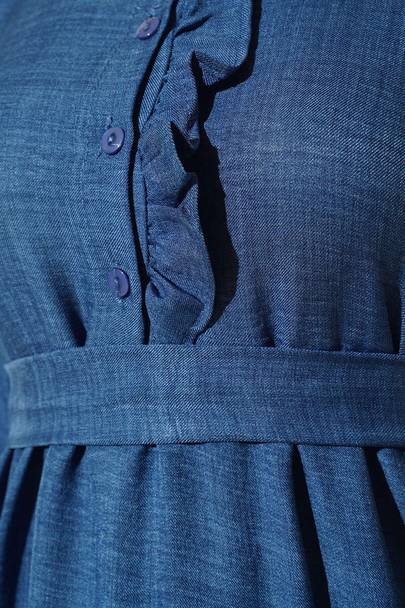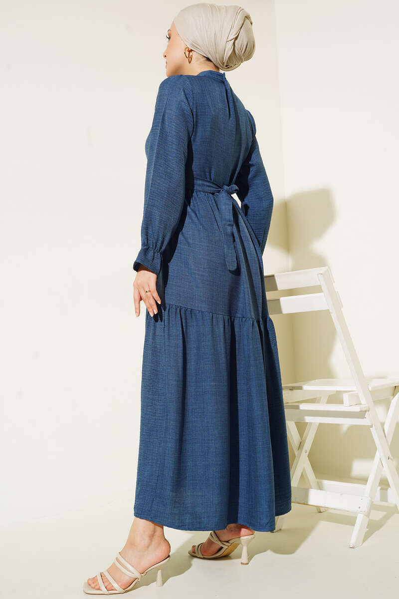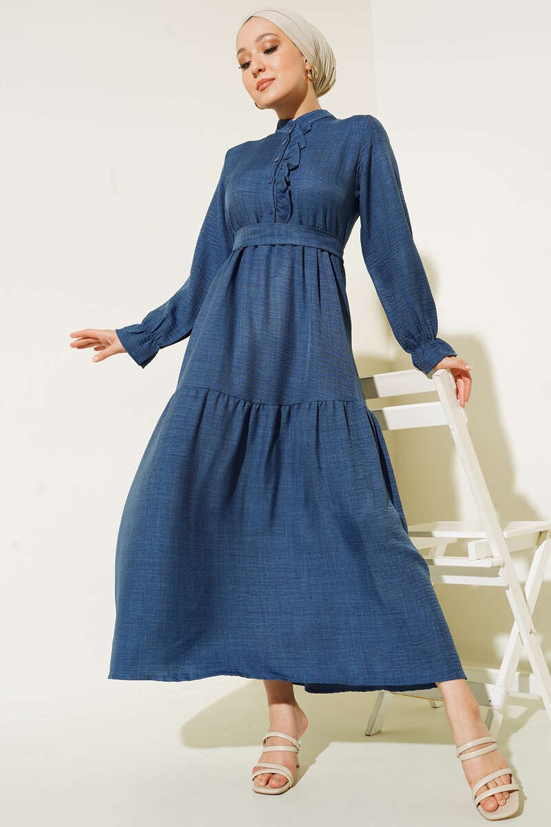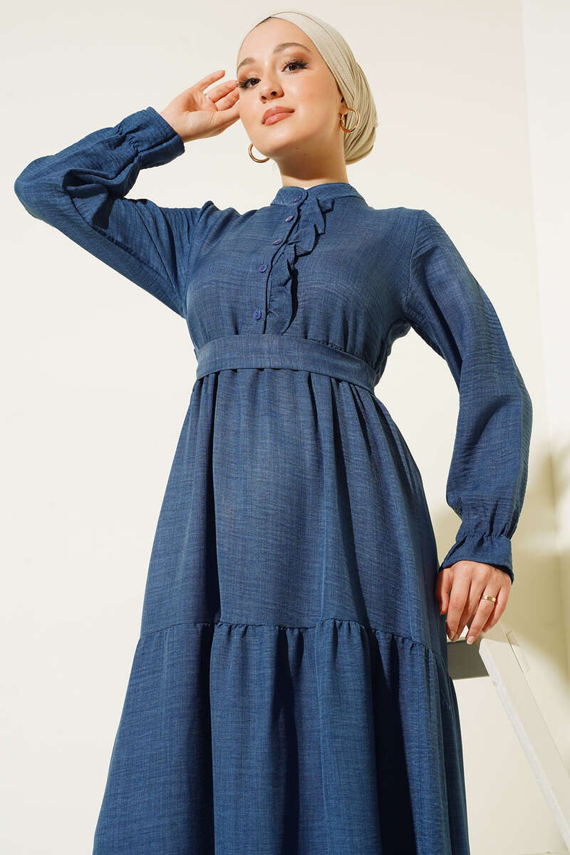 Meloni Keten Hakim Yaka Düğmeli Elbise Lacivert