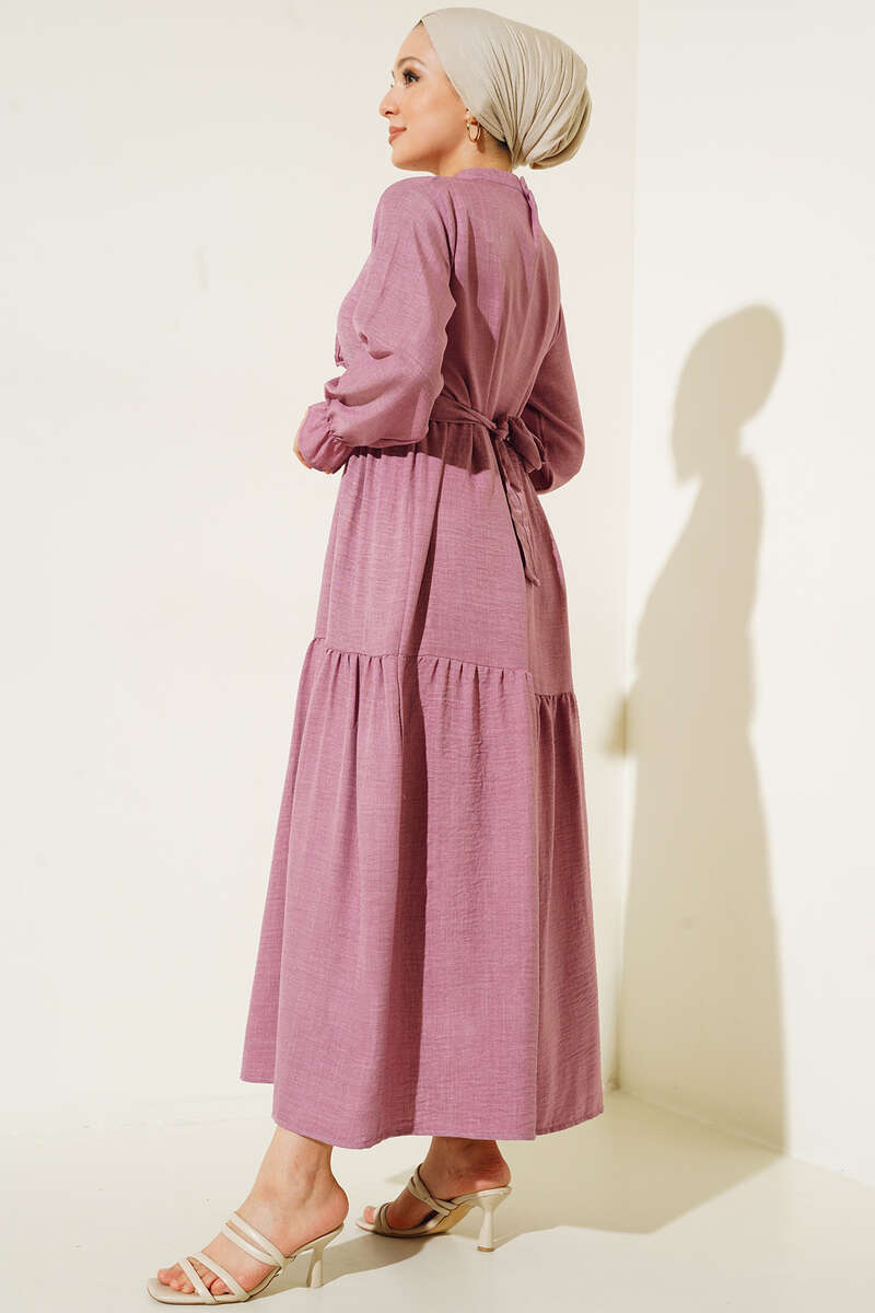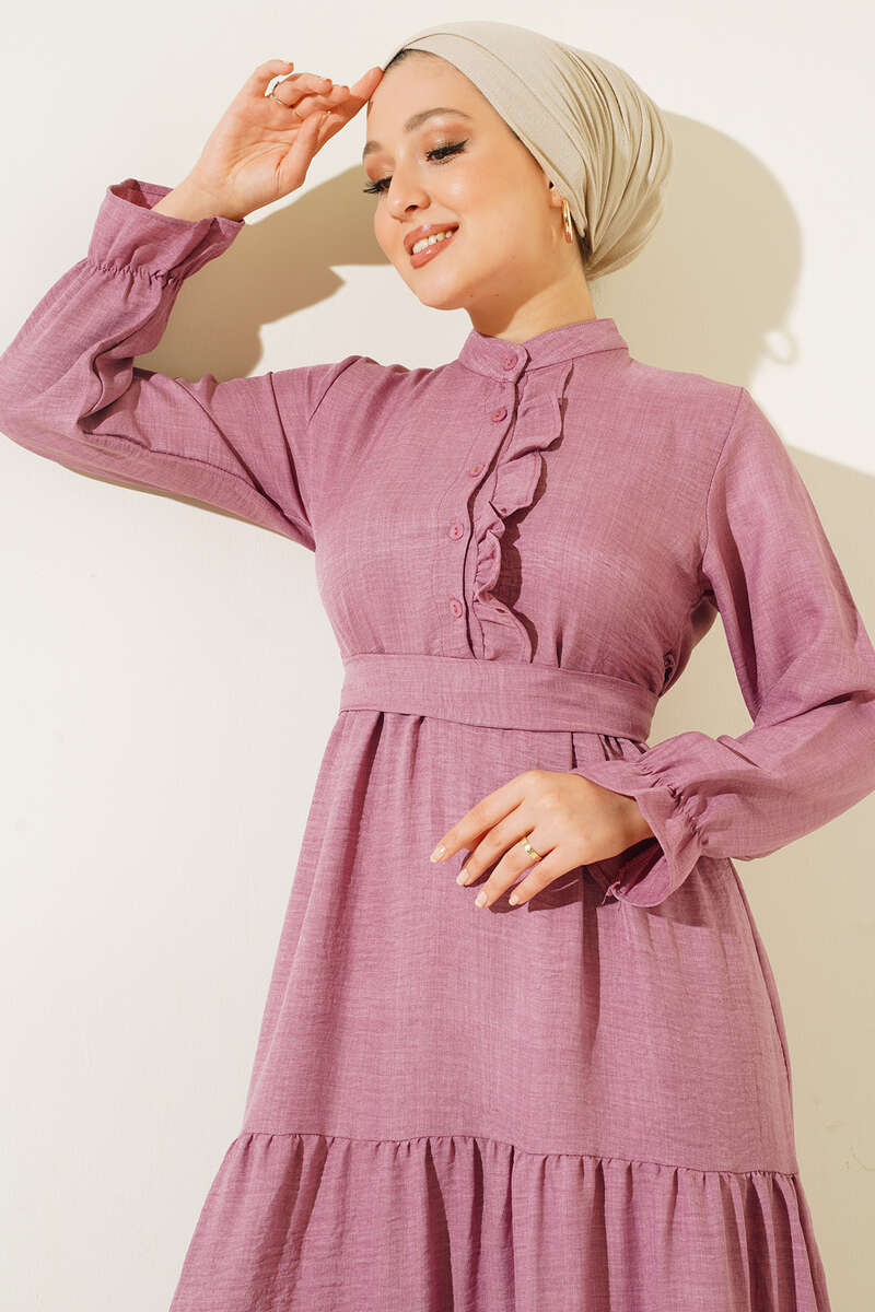 Meloni Keten Hakim Yaka Düğmeli Elbise Lila