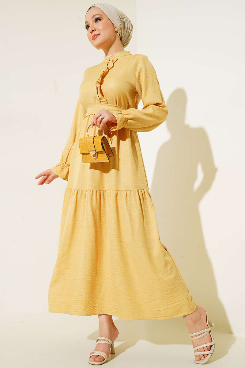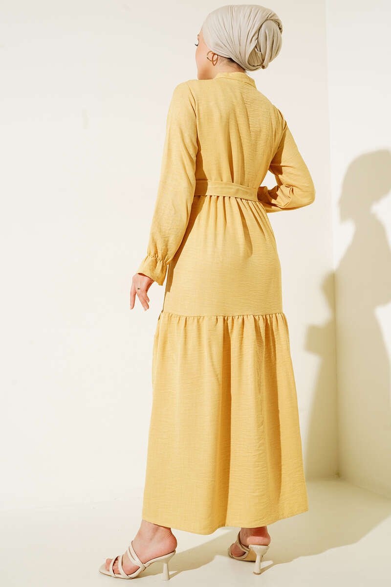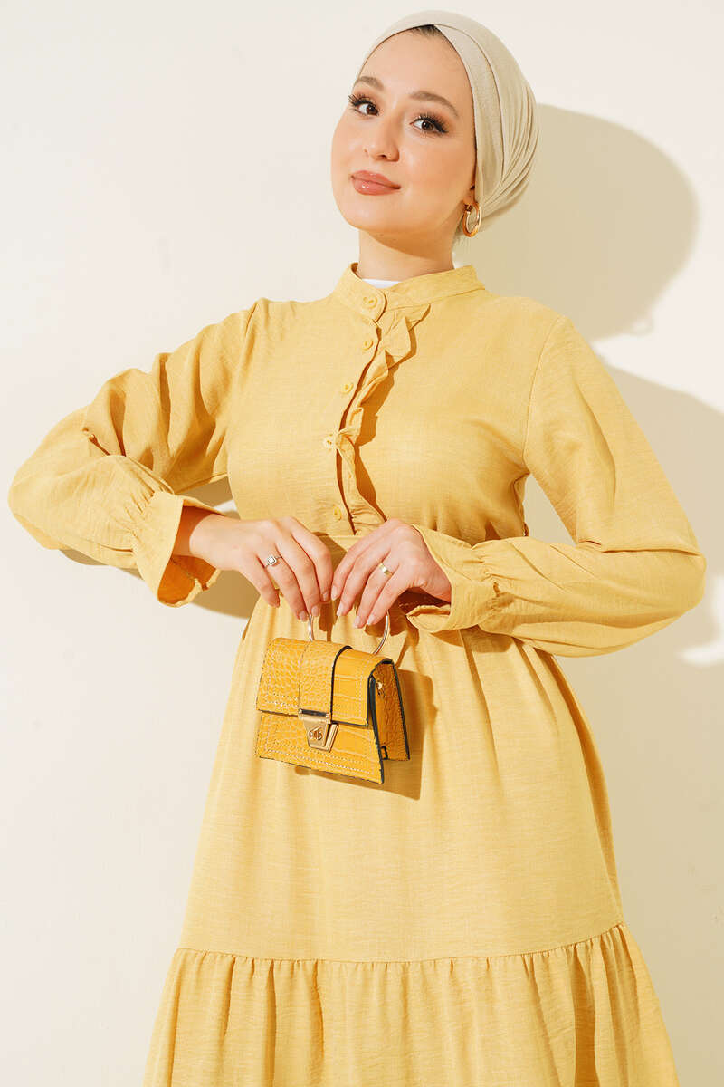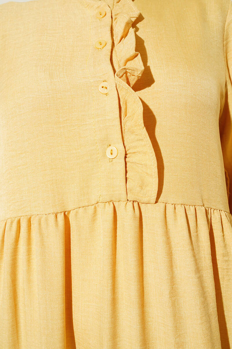 Meloni Keten Hakim Yaka Düğmeli Elbise Sarı