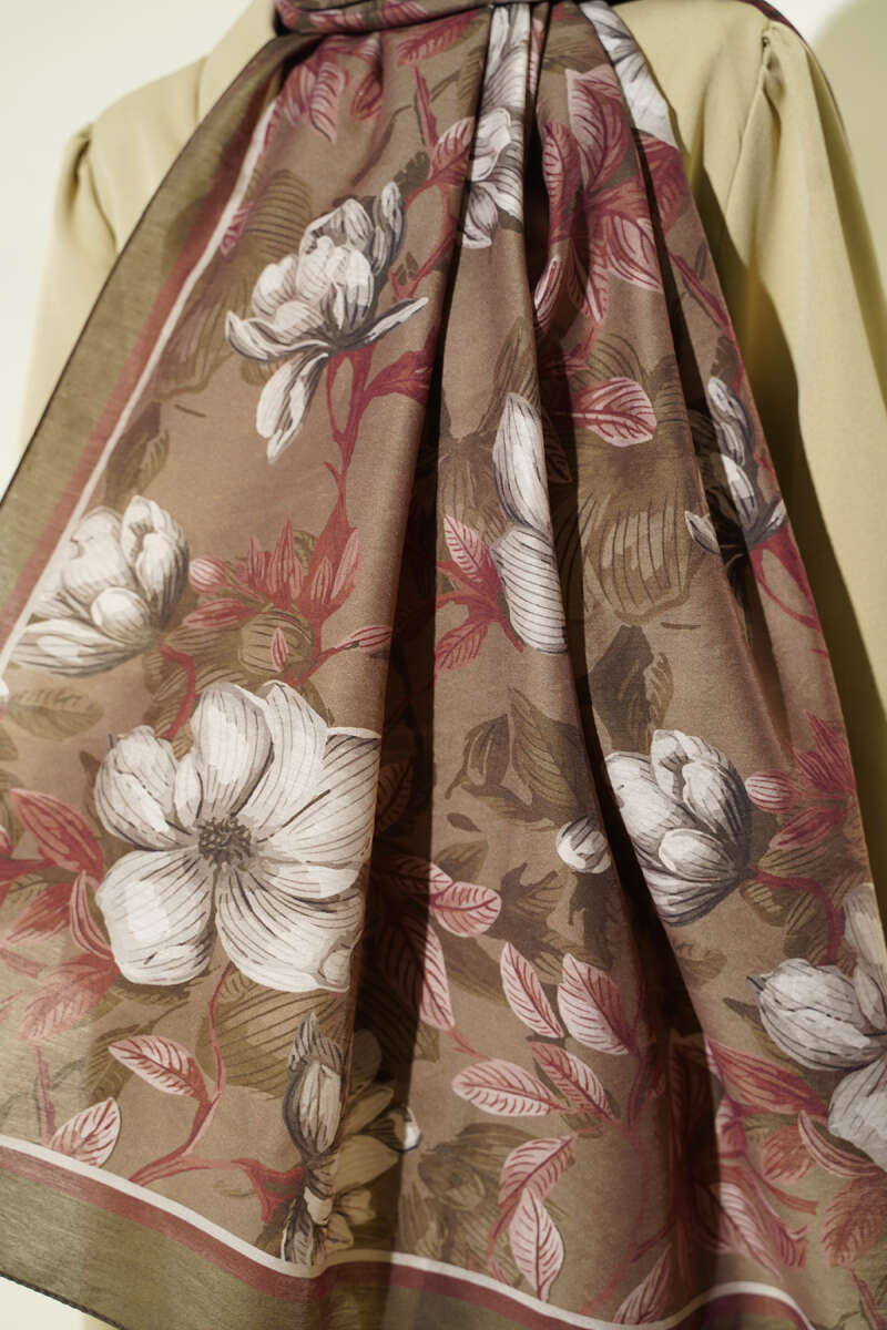 Çiçekli Soft Bambu Kraş Şal Haki