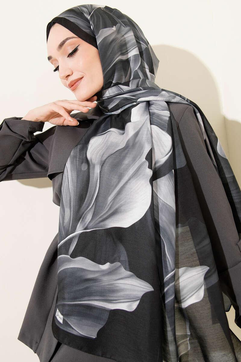 Çiçekli Şeritli Bambu Kraş Eşarp Gri