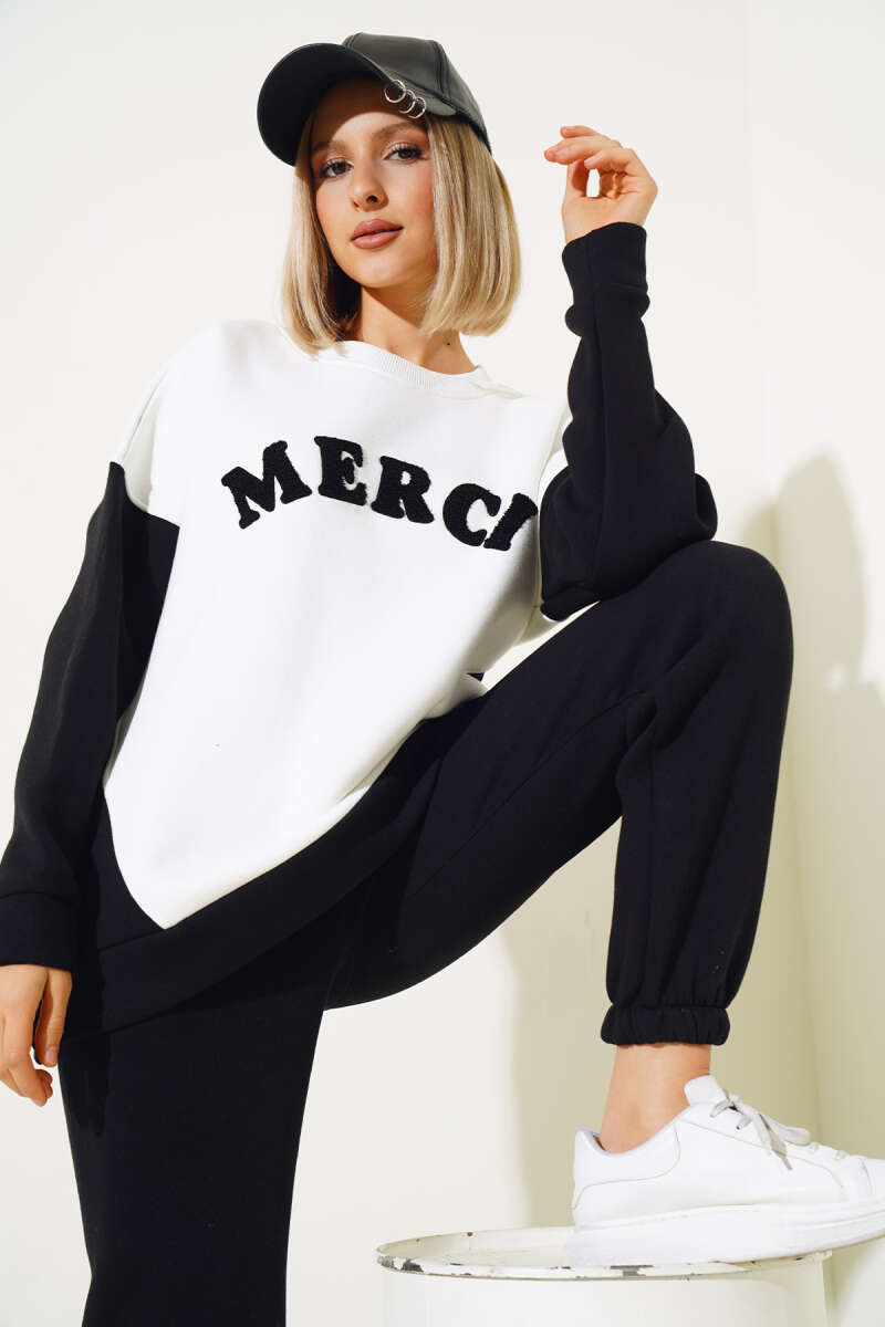 Yıldız Baskılı Kapüşonlu Şardonlu Sweat Ekru