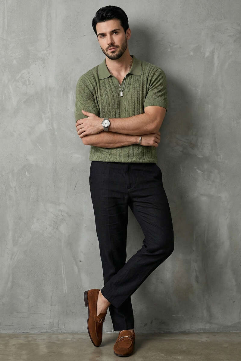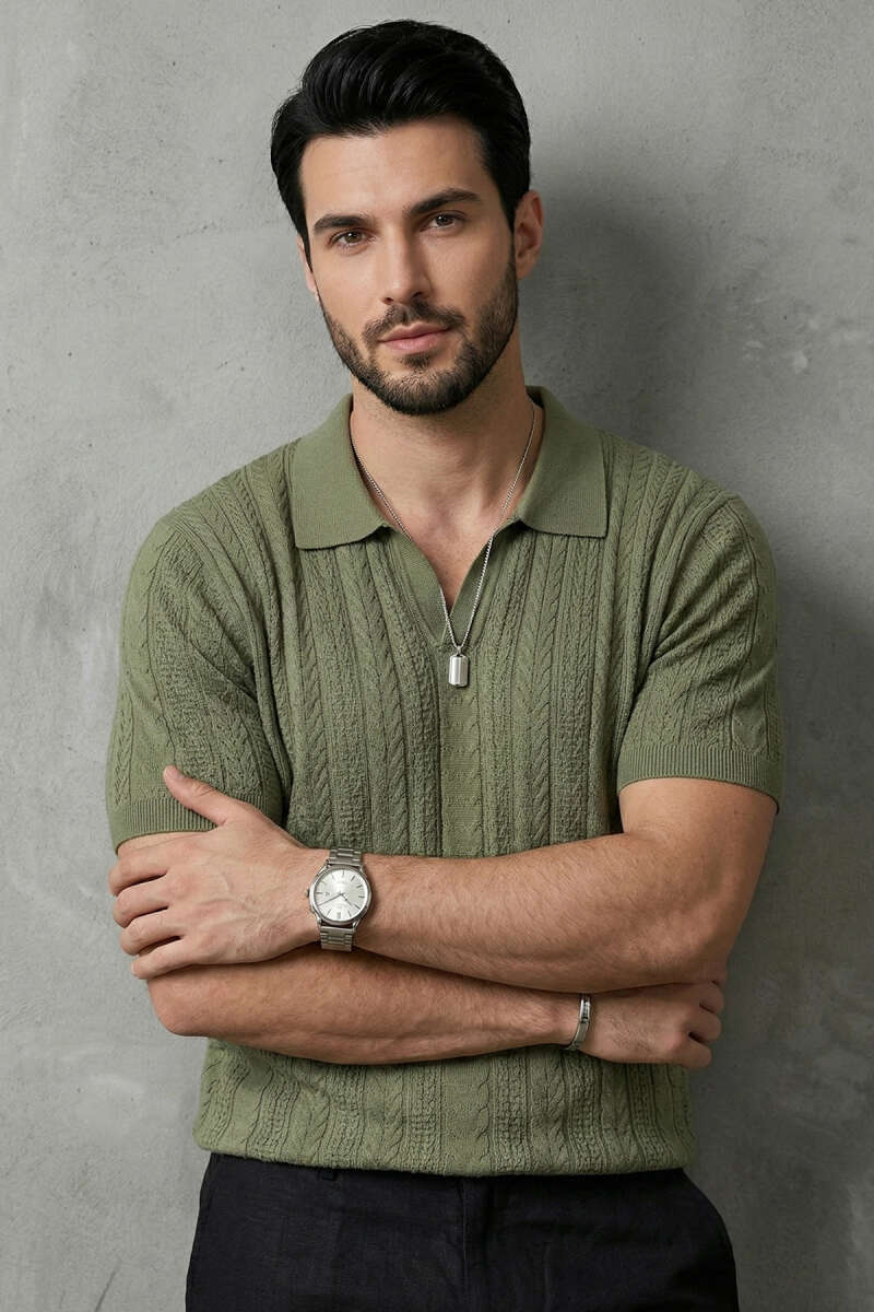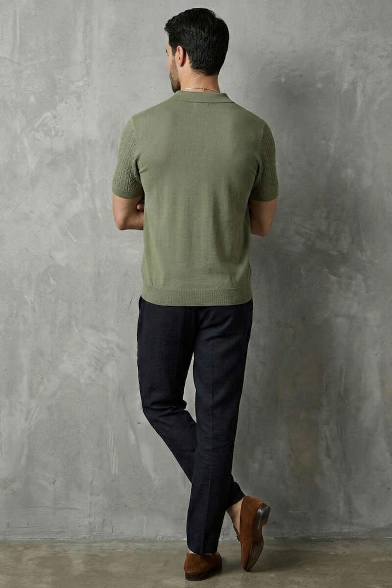 Merserize Açık Polo Yaka Erkek T-shirt Haki
