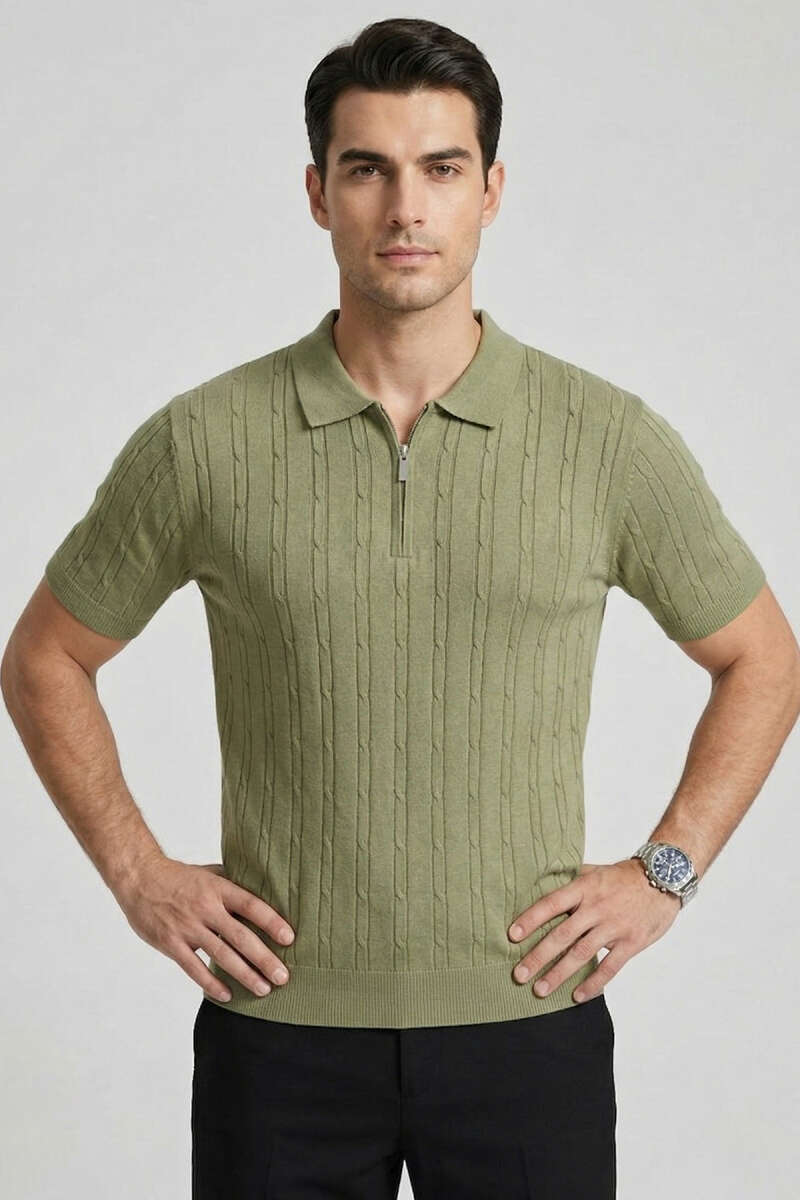 Merserize Fermuarlı Erkek T-shirt Haki