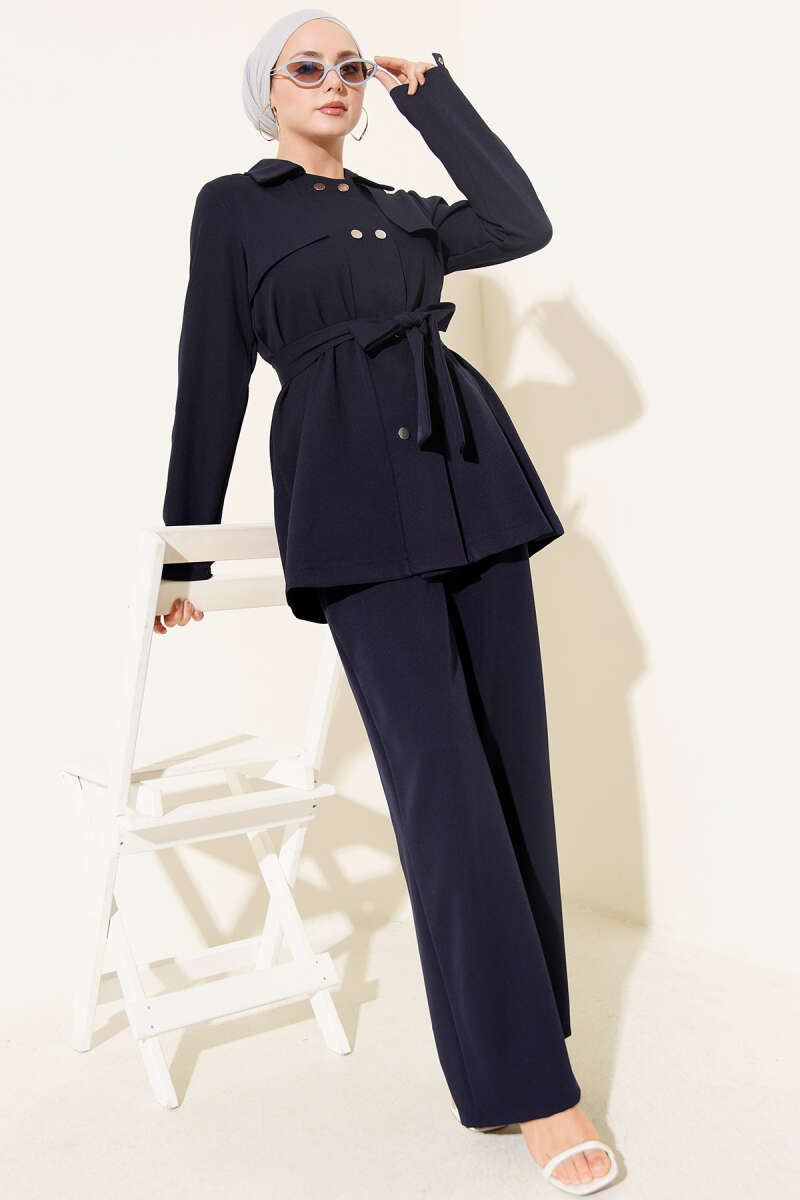 Taşlı Bel Tünelli Tunik İkili Takım Lacivert