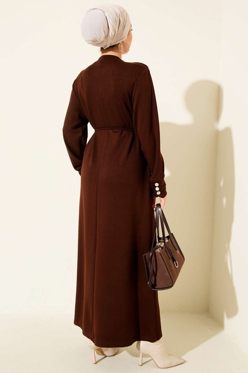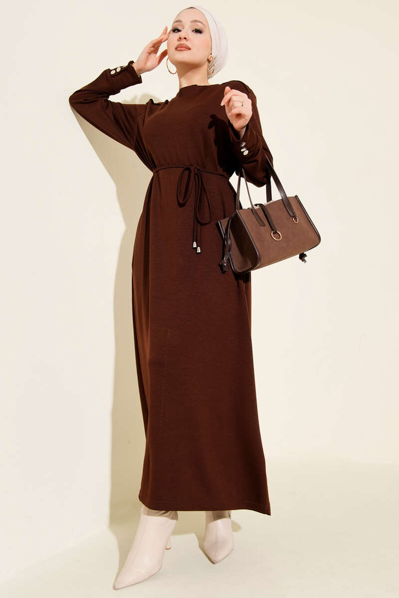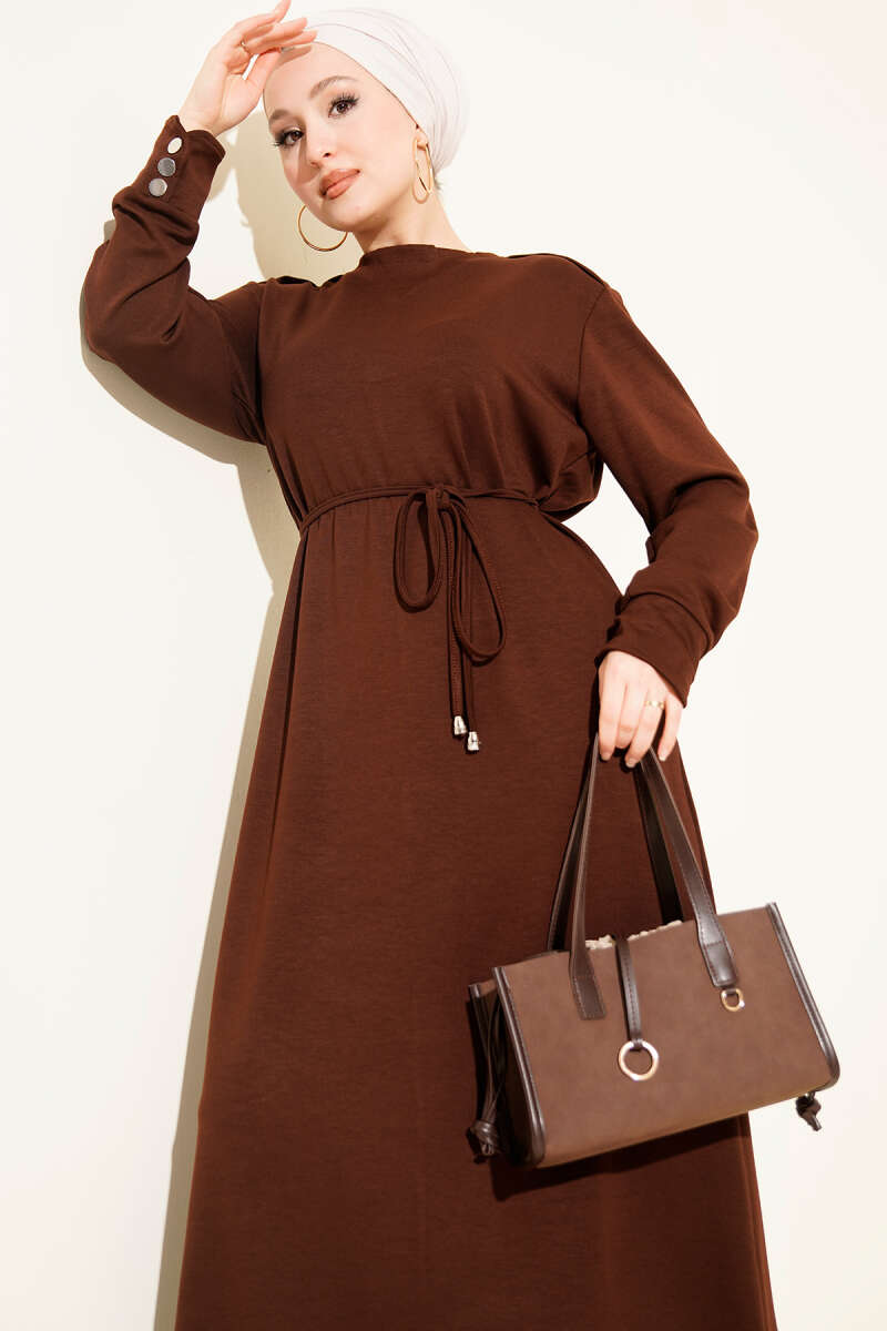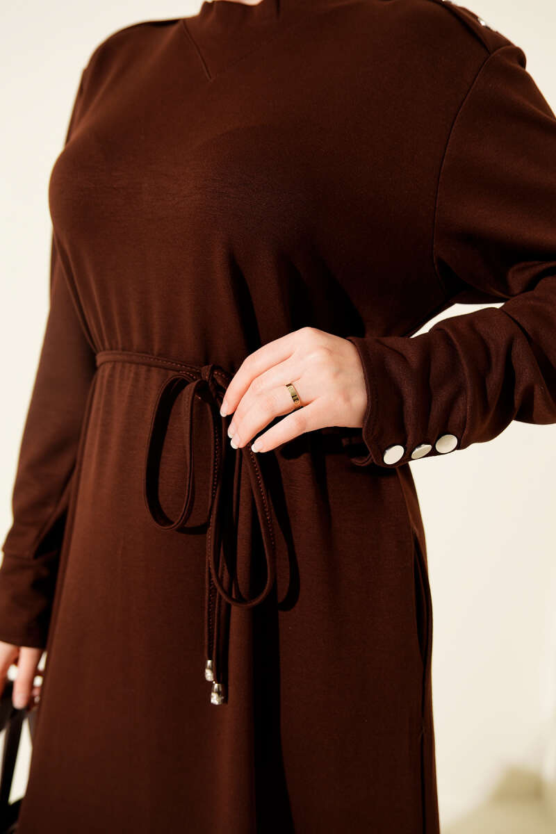 Metal Düğme Süslemeli Bağcıklı Elbise Kahve