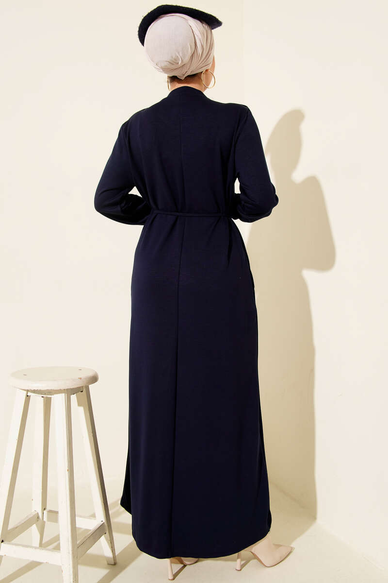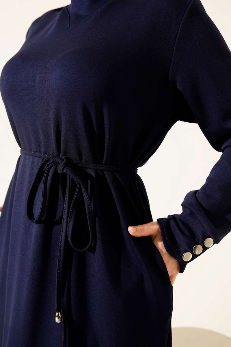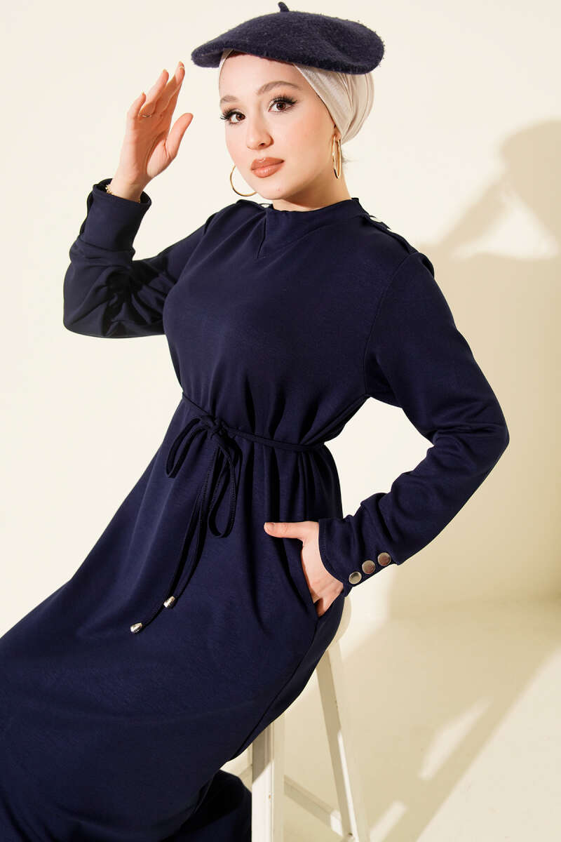 Metal Düğme Süslemeli Bağcıklı Elbise Lacivert