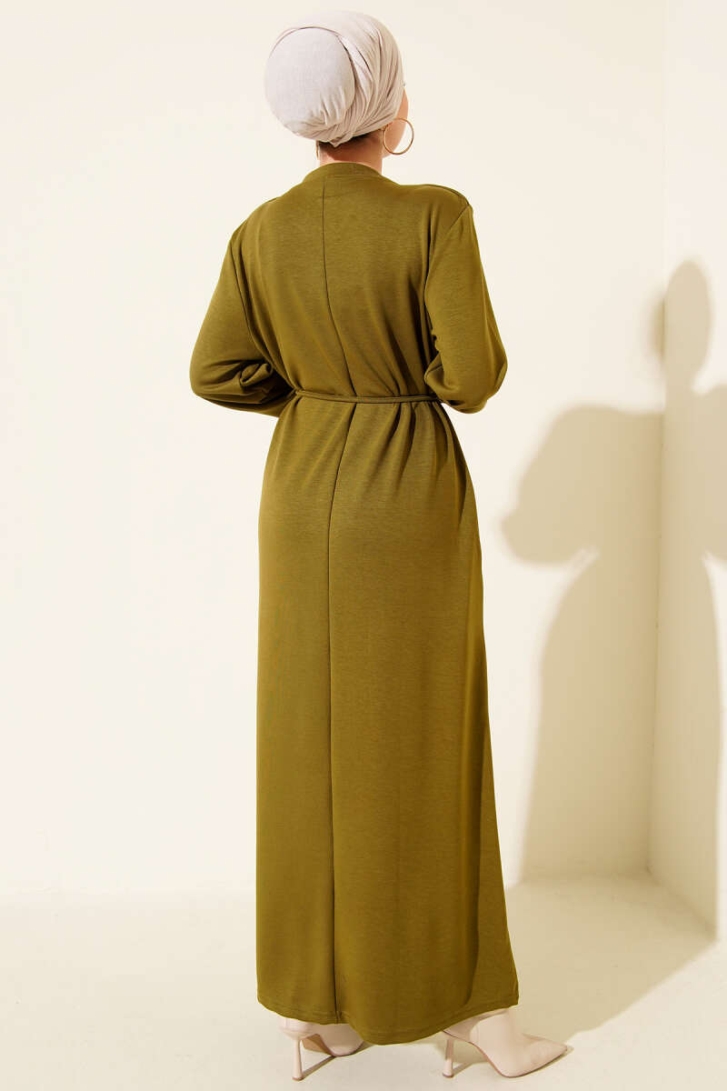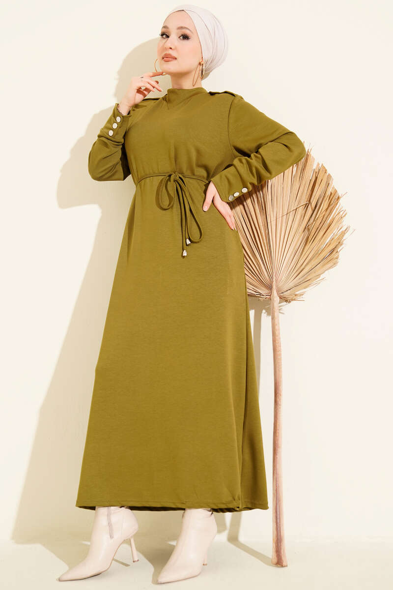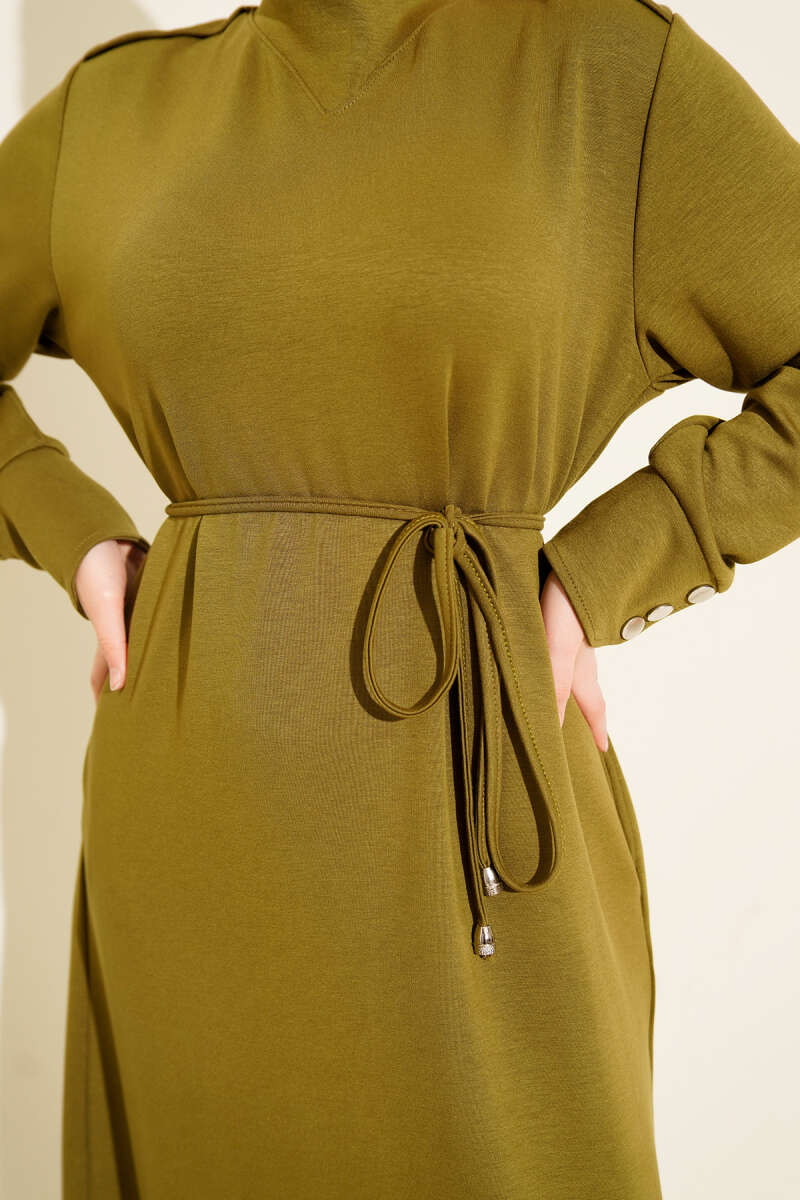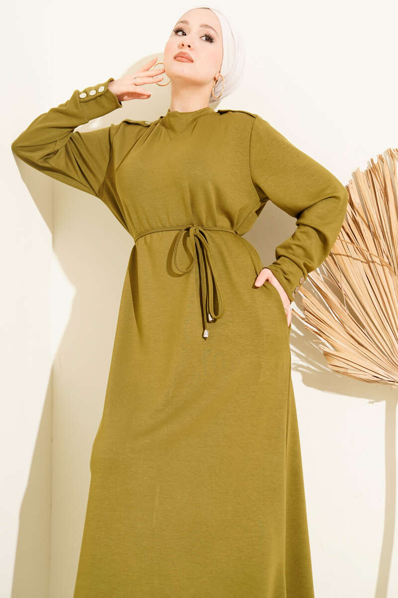 Metal Düğme Süslemeli Bağcıklı Elbise Yağ Yeşili
