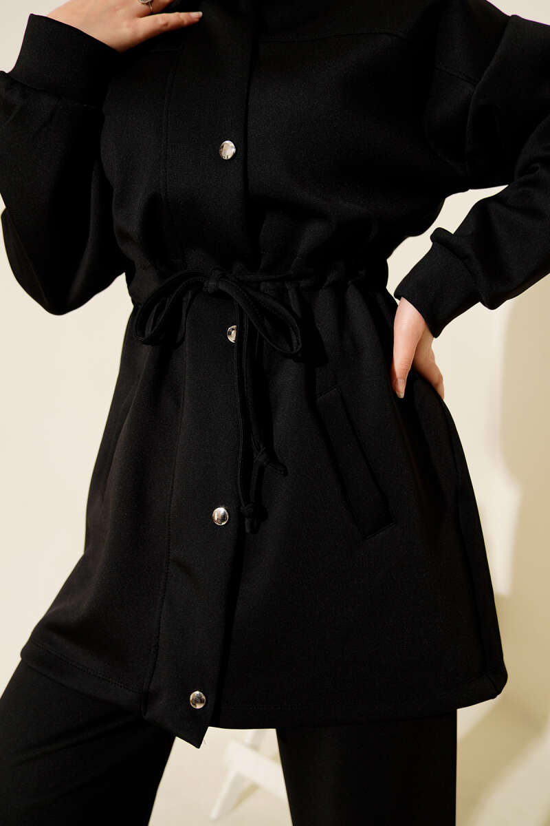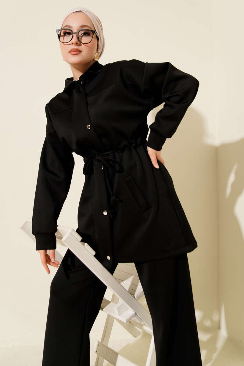 Önü Bağlamalı Çizgili Etekli Takım Siyah