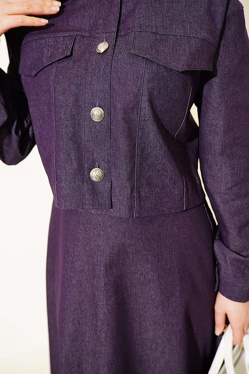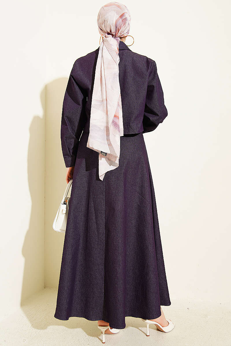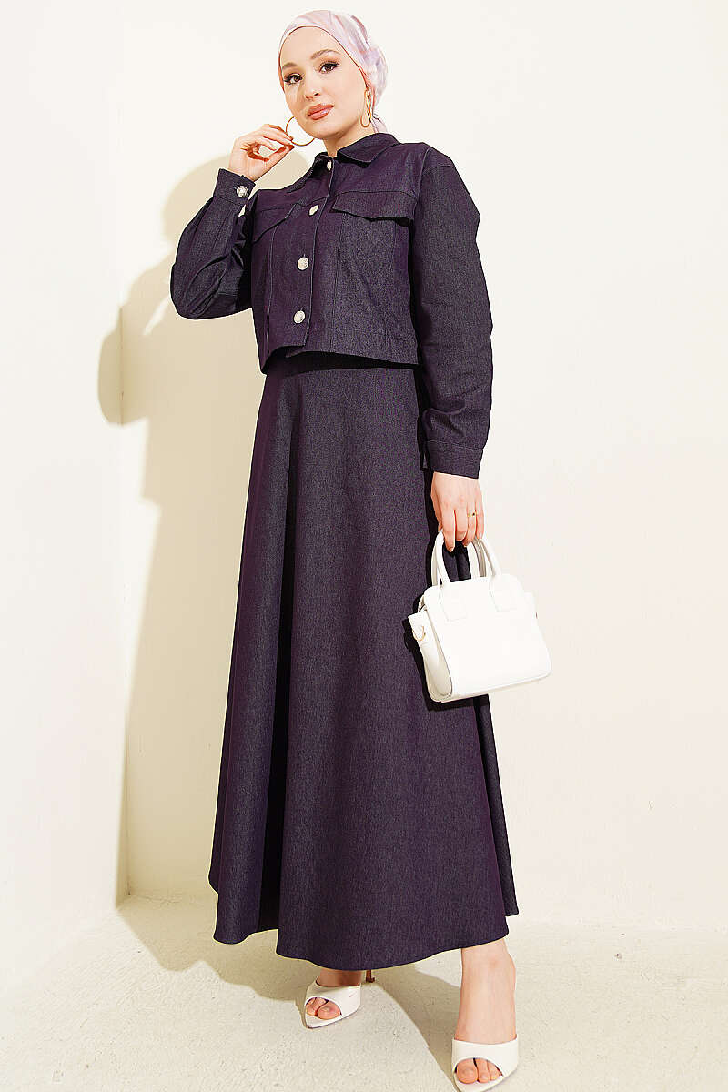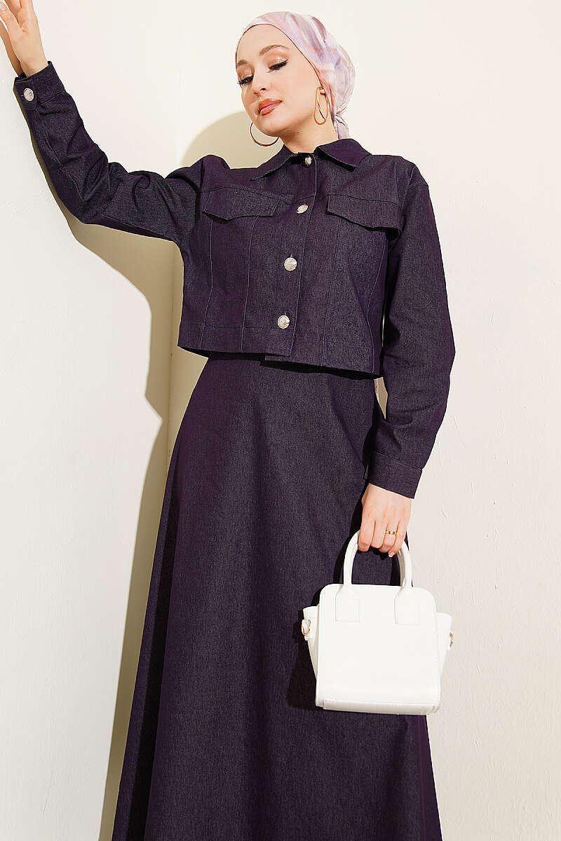 Metal Düğmeli Ceketli Kot Jile Takım Mor