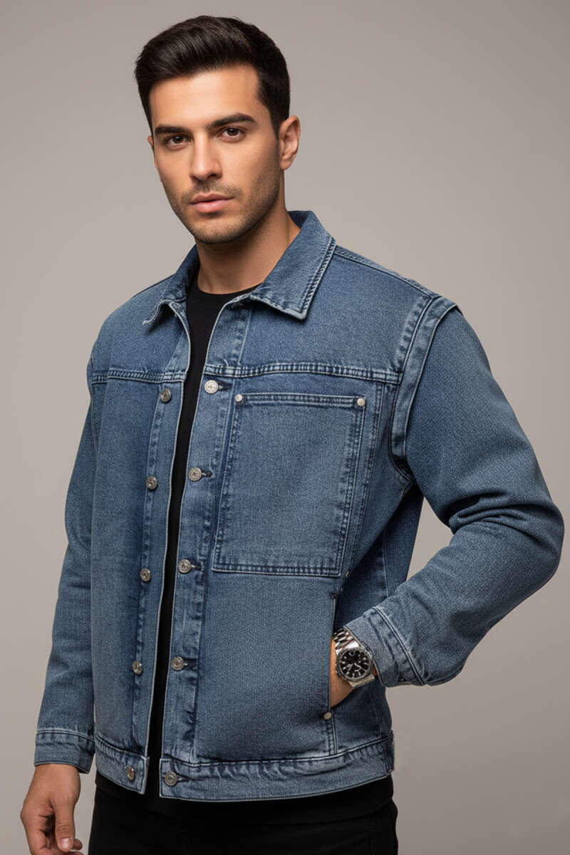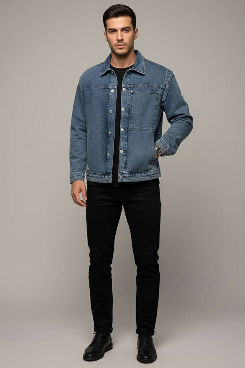 Düğmeli Oversize Denim Erkek Ceket Mavi Kar