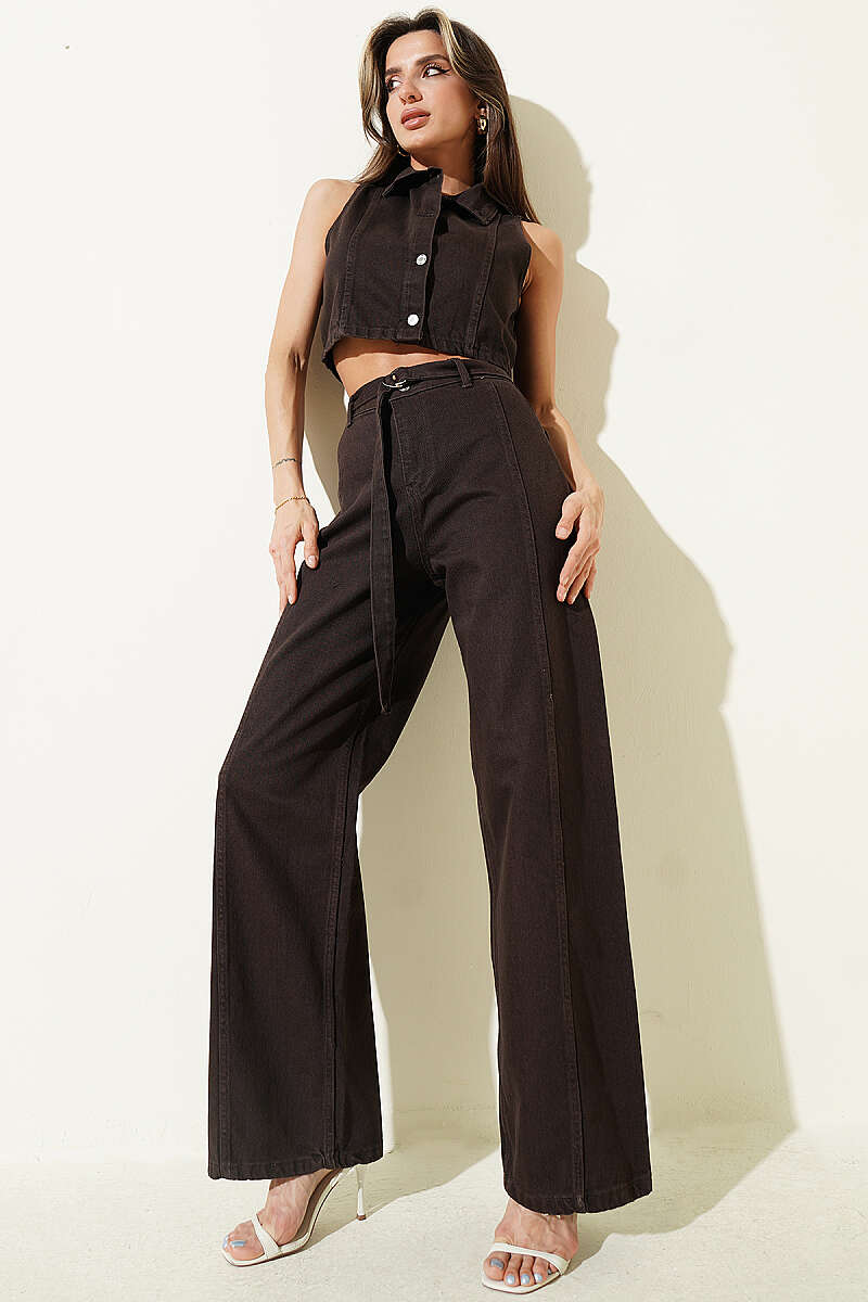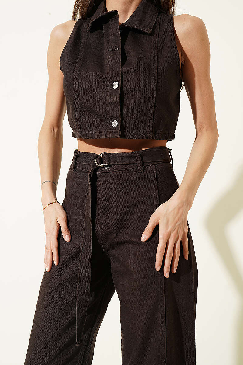 Metal Düğmeli Crop Yelekli Kot İkili Takım Kahve