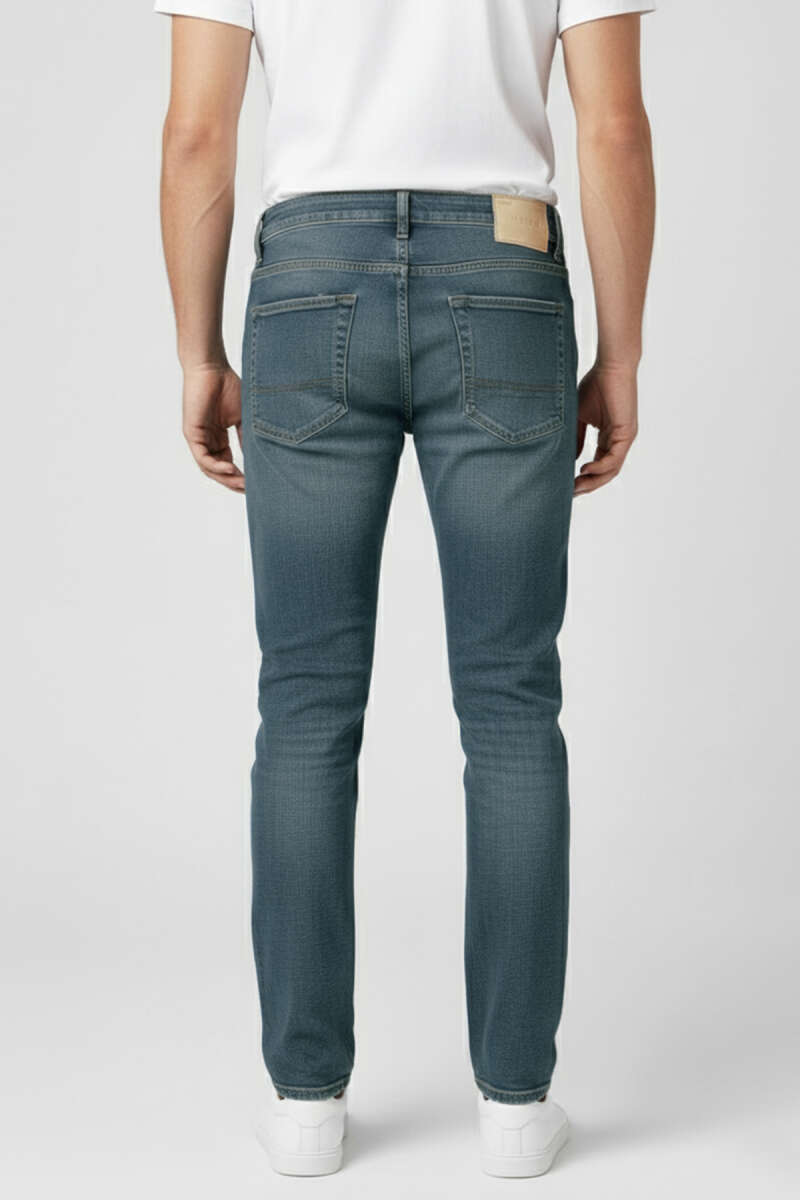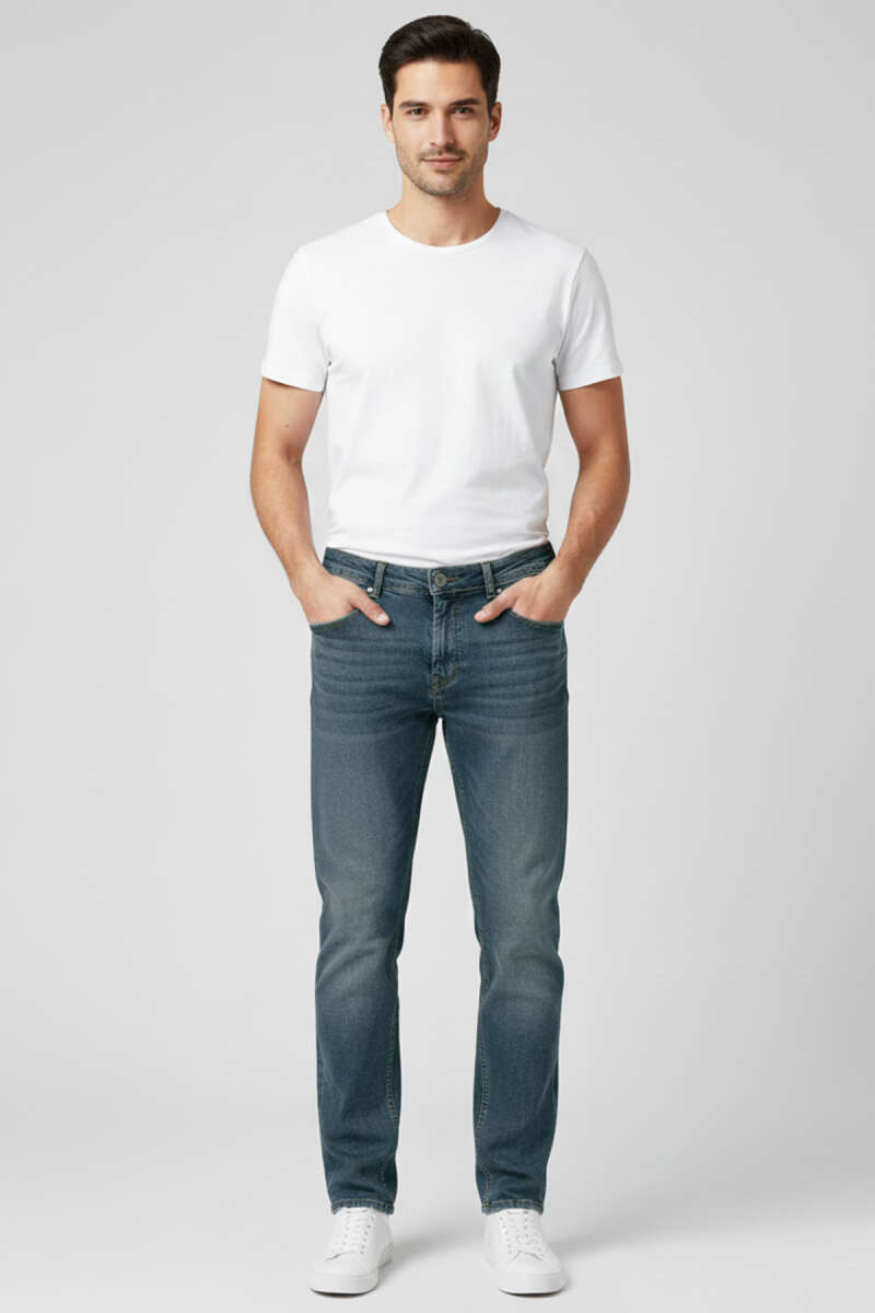 Metal Düğmeli Dar Paça Erkek Kot Pantolon Orta Mavi