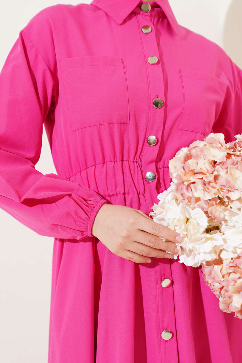 Metal Düğmeli Elbise Fusya