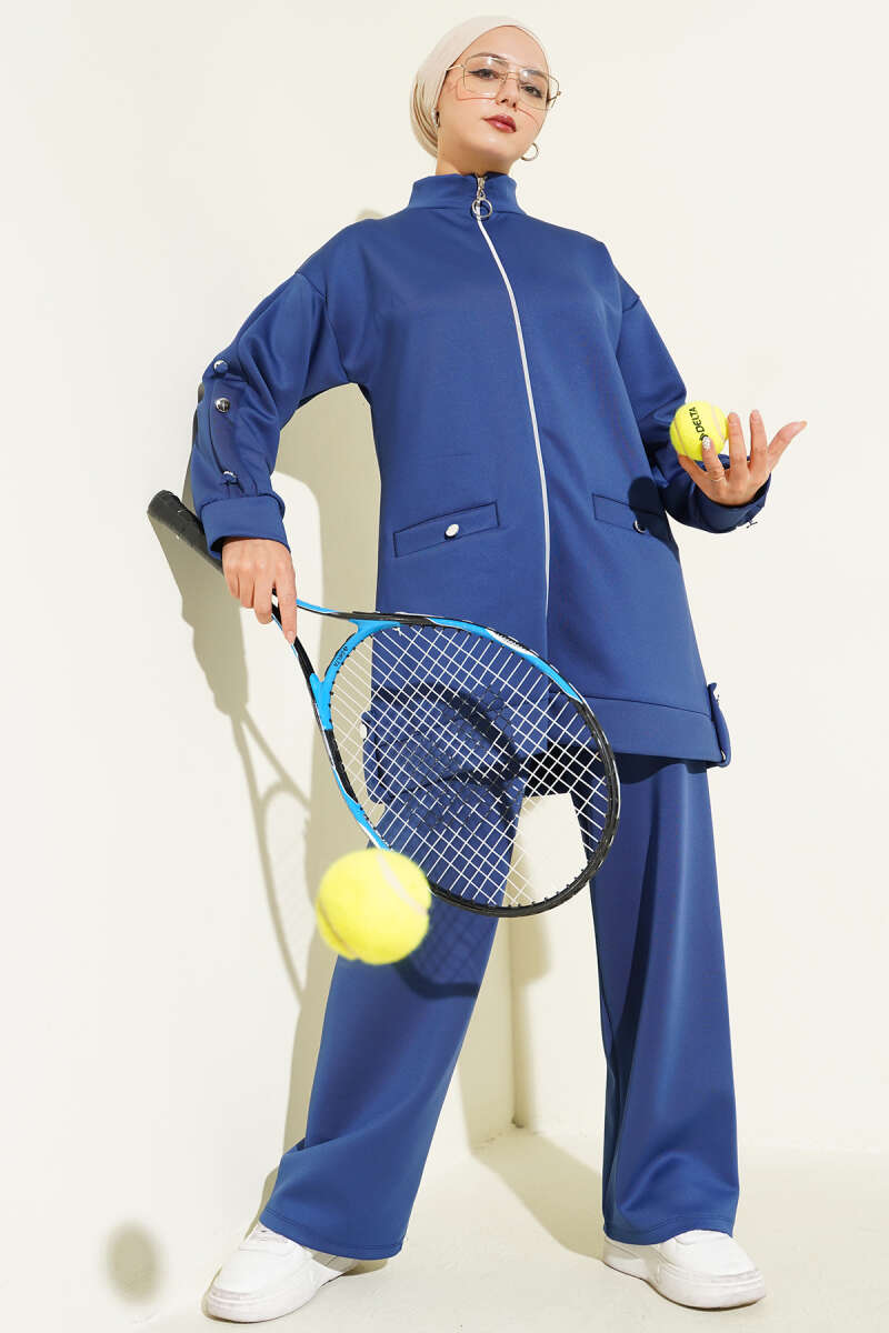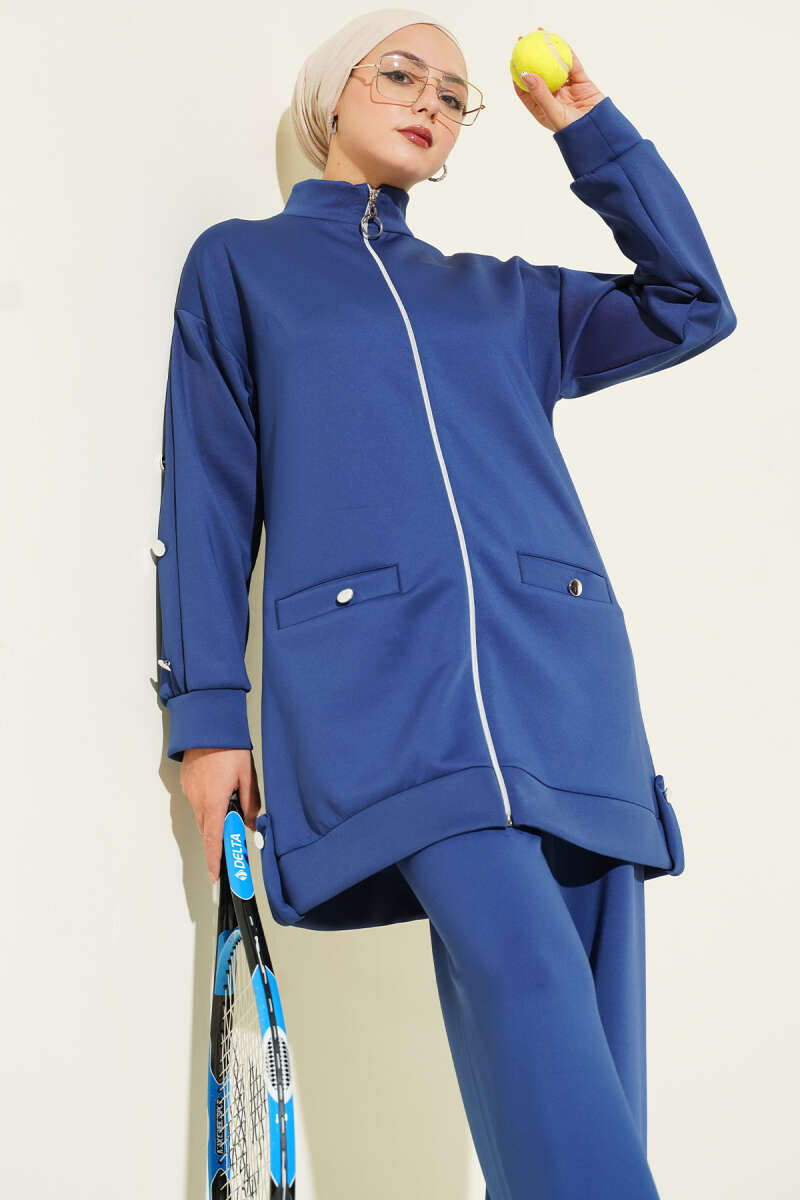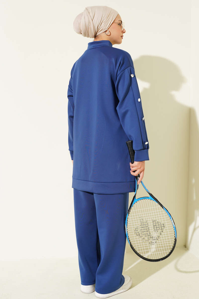 Kol Şeritli Düğmeli Scuba İkili Takım Lacivert