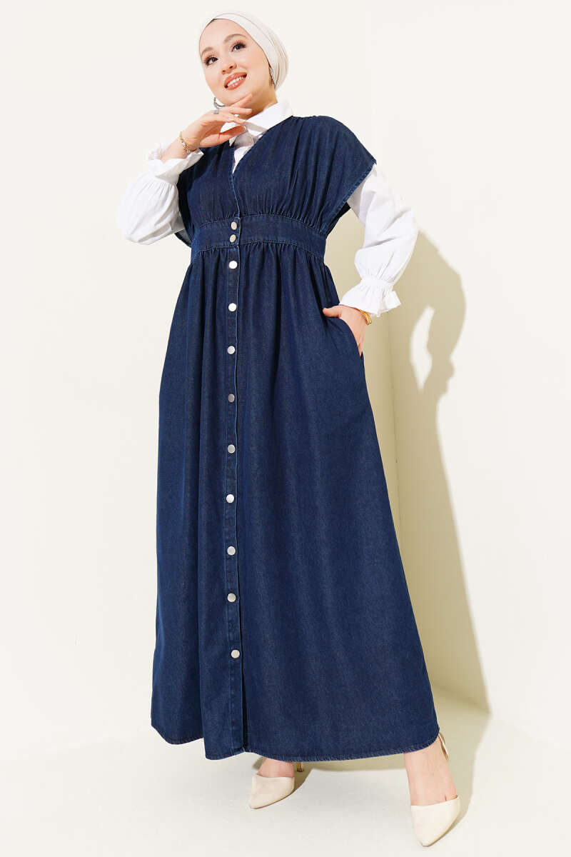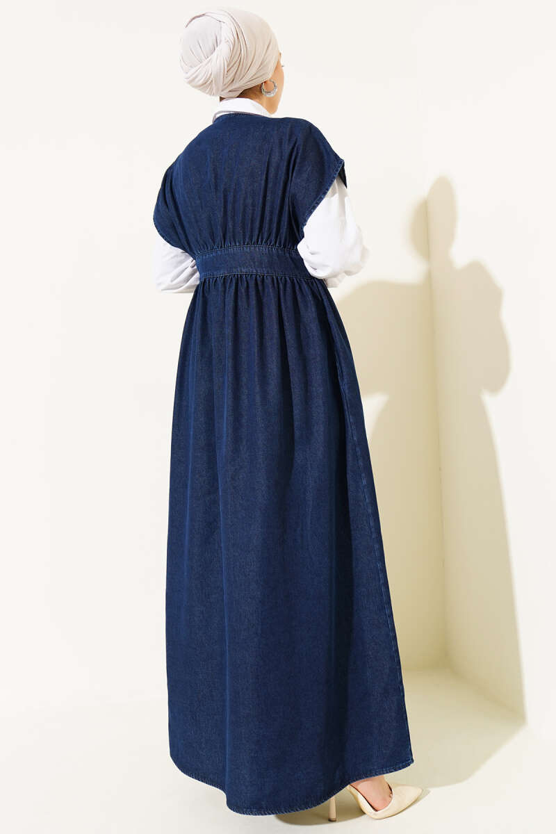 Metal Düğmeli Kolsuz Kot Elbise Lacivert