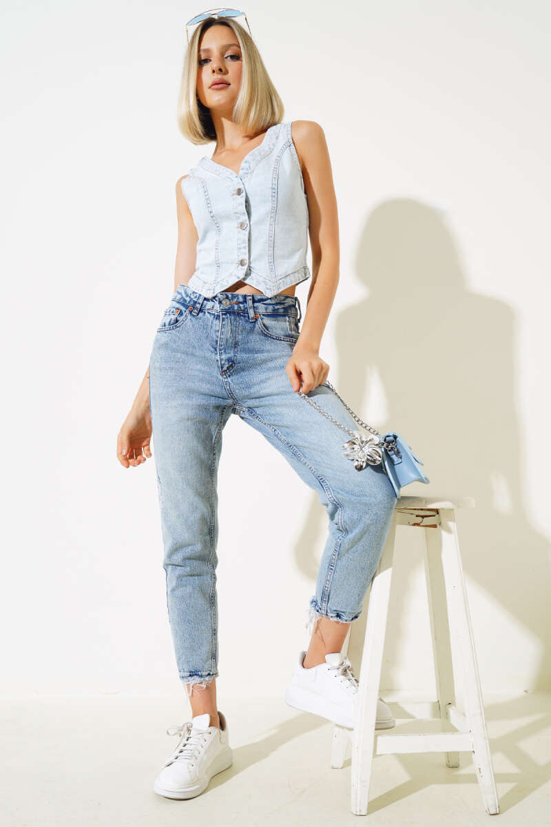 Metal Düğmeli Kot Yelek Buz Mavisi