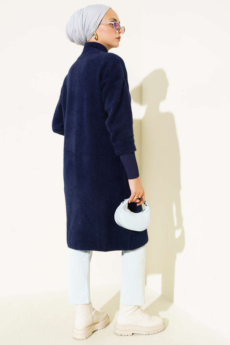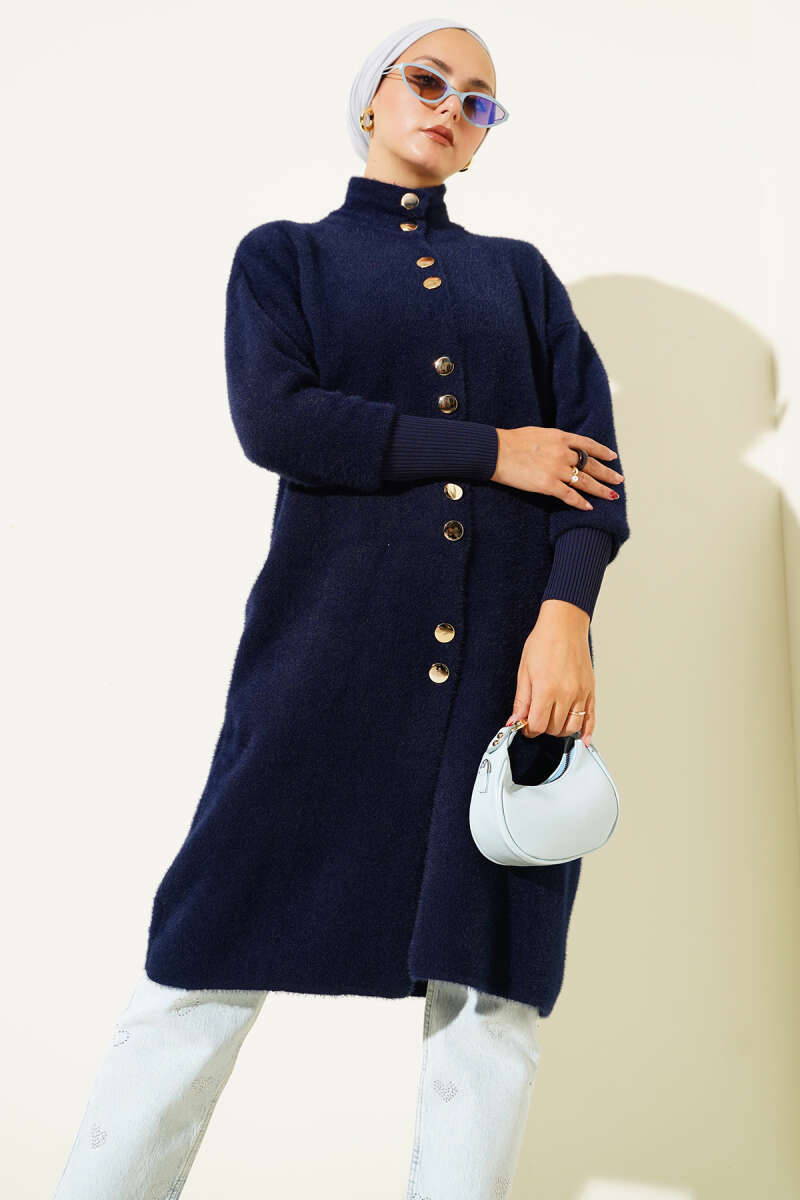 Saç Örgülü Düğmeli Triko Hırka Lacivert