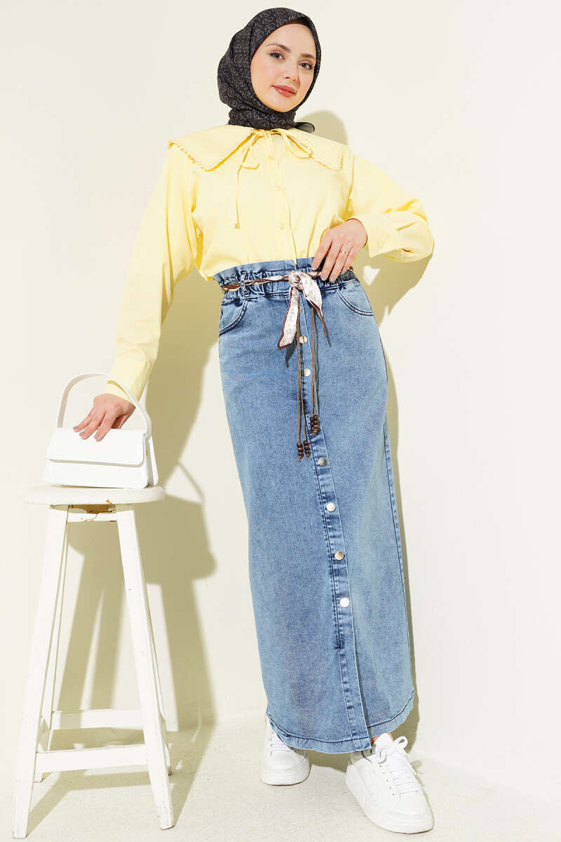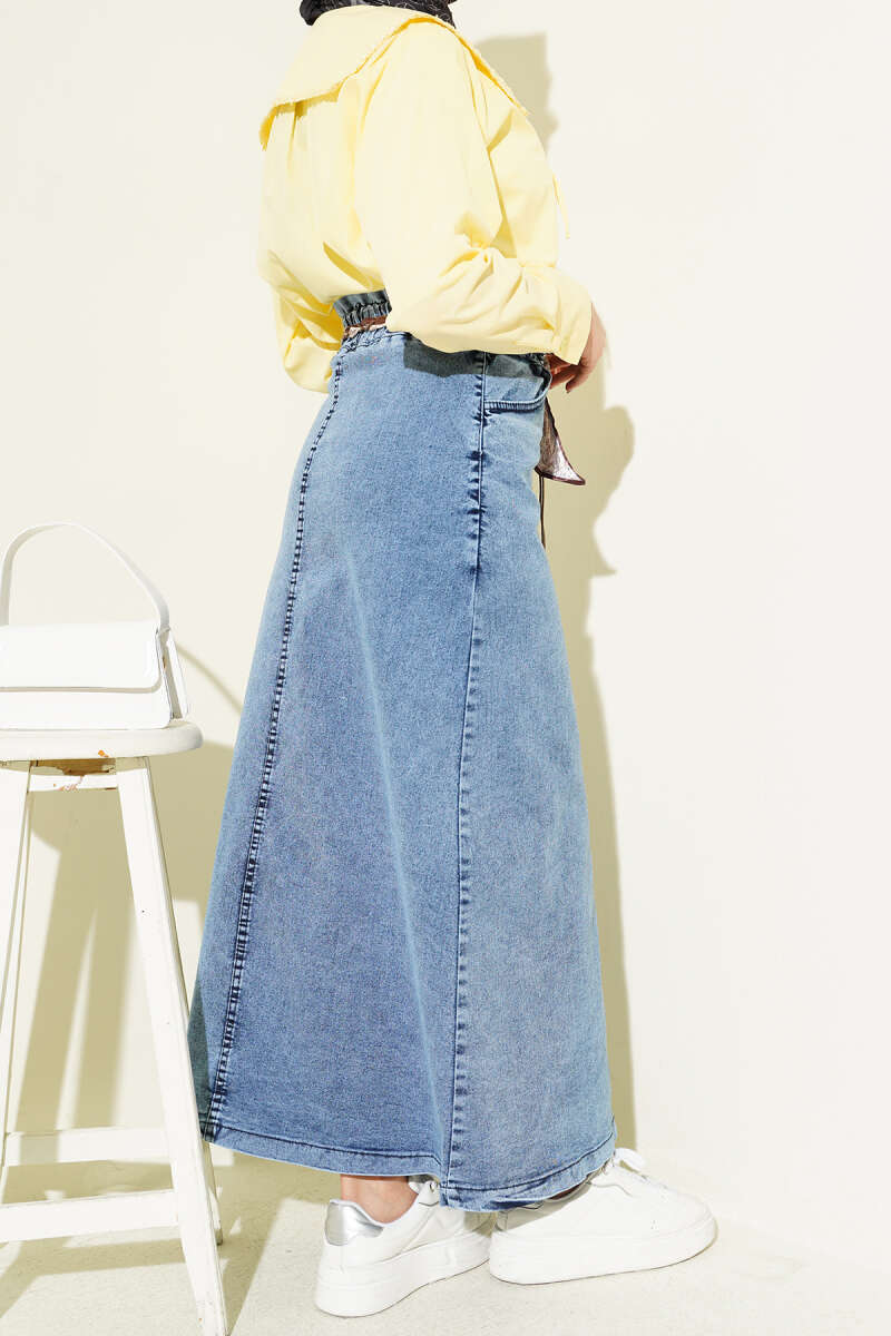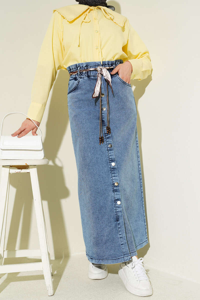 Metal Düğmeli Şal Kemerli Kot Etek Açık Mavi
