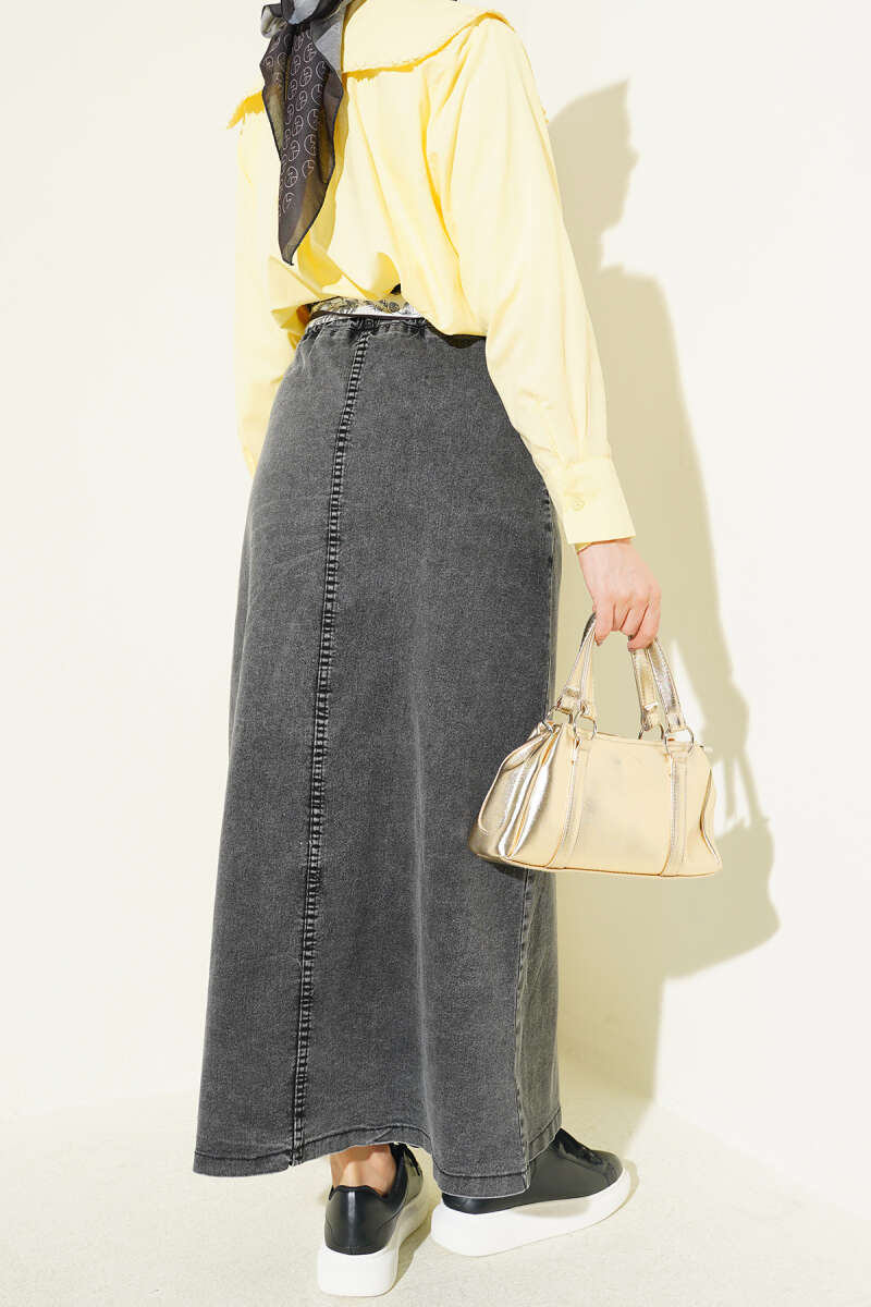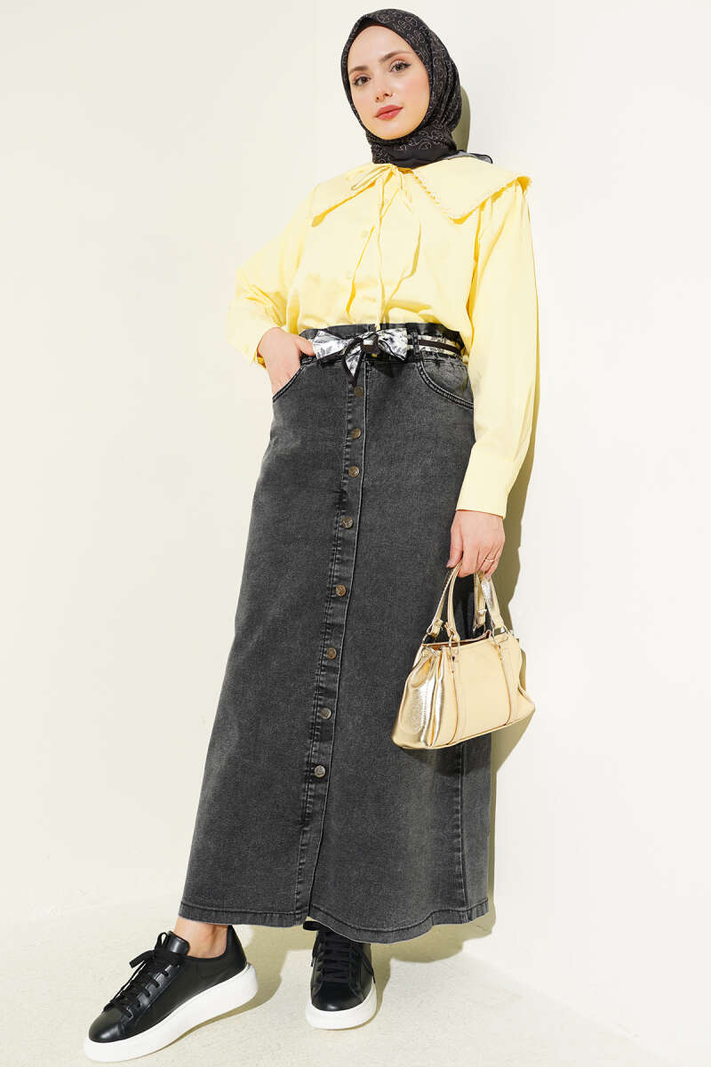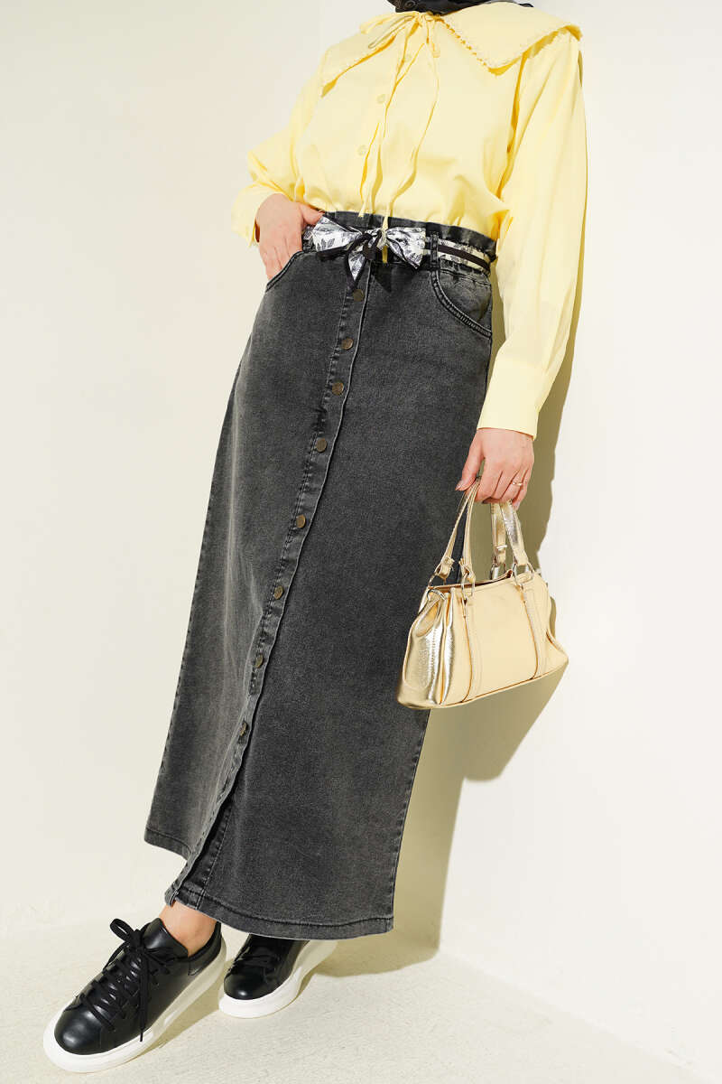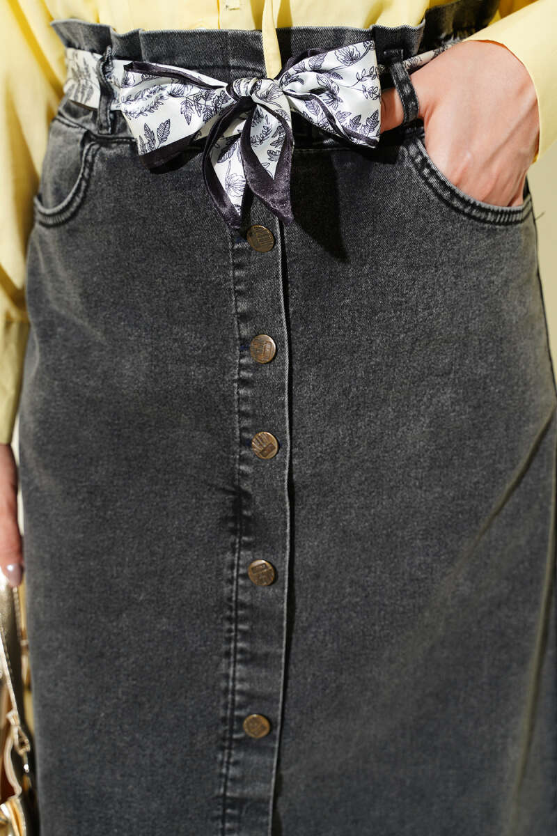 Metal Düğmeli Şal Kemerli Kot Etek Füme