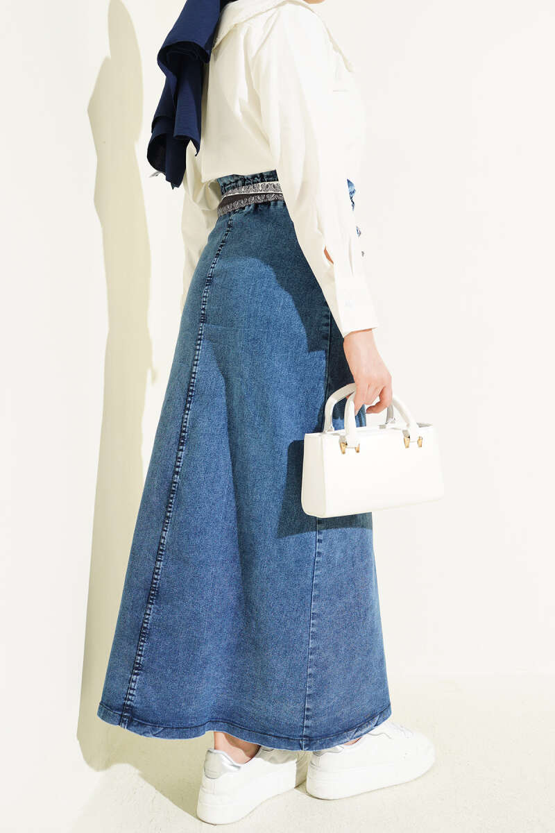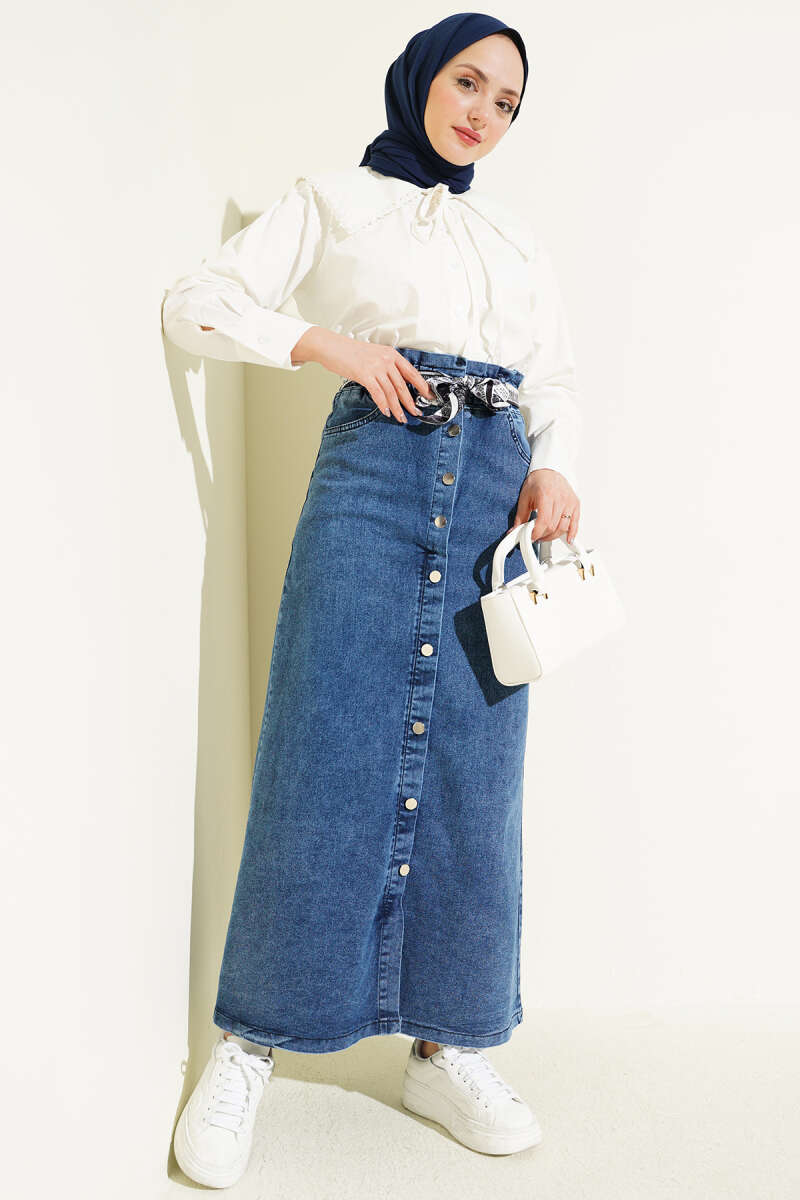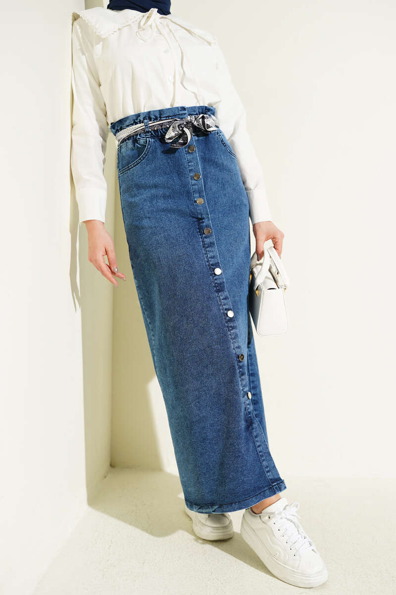 Metal Düğmeli Şal Kemerli Kot Etek Kot Mavisi