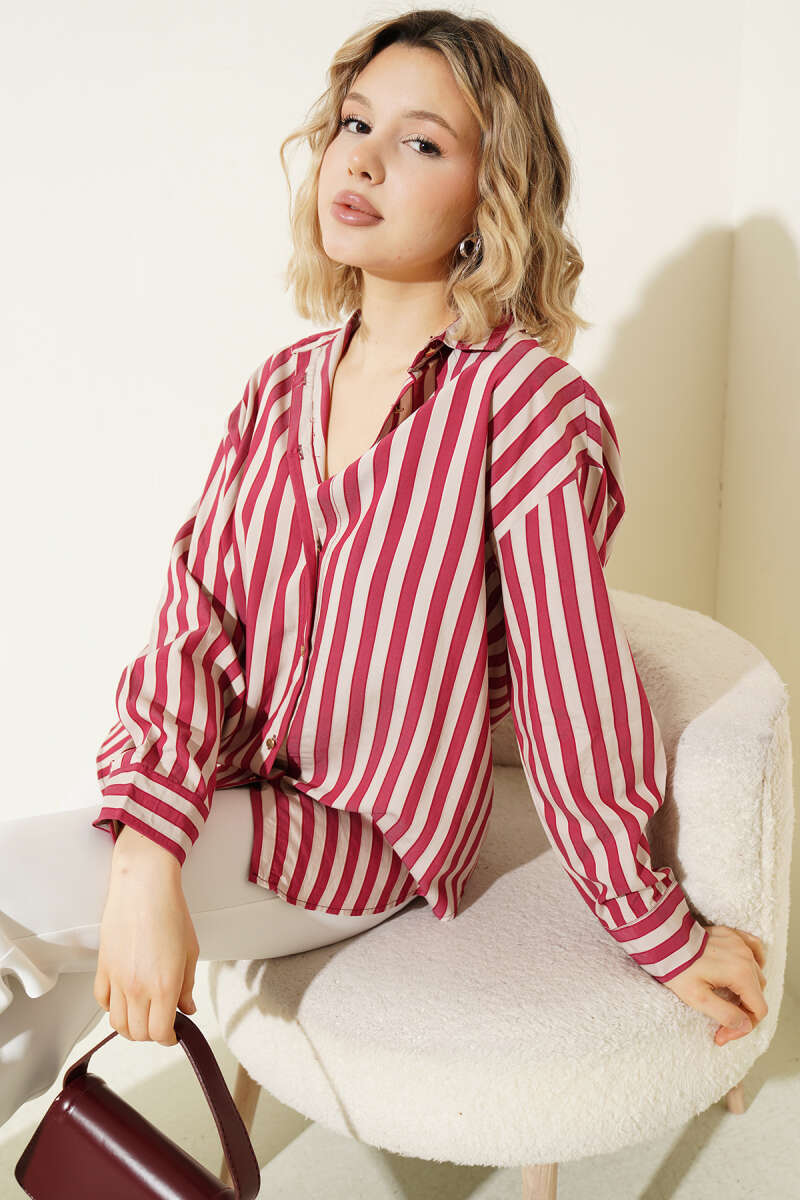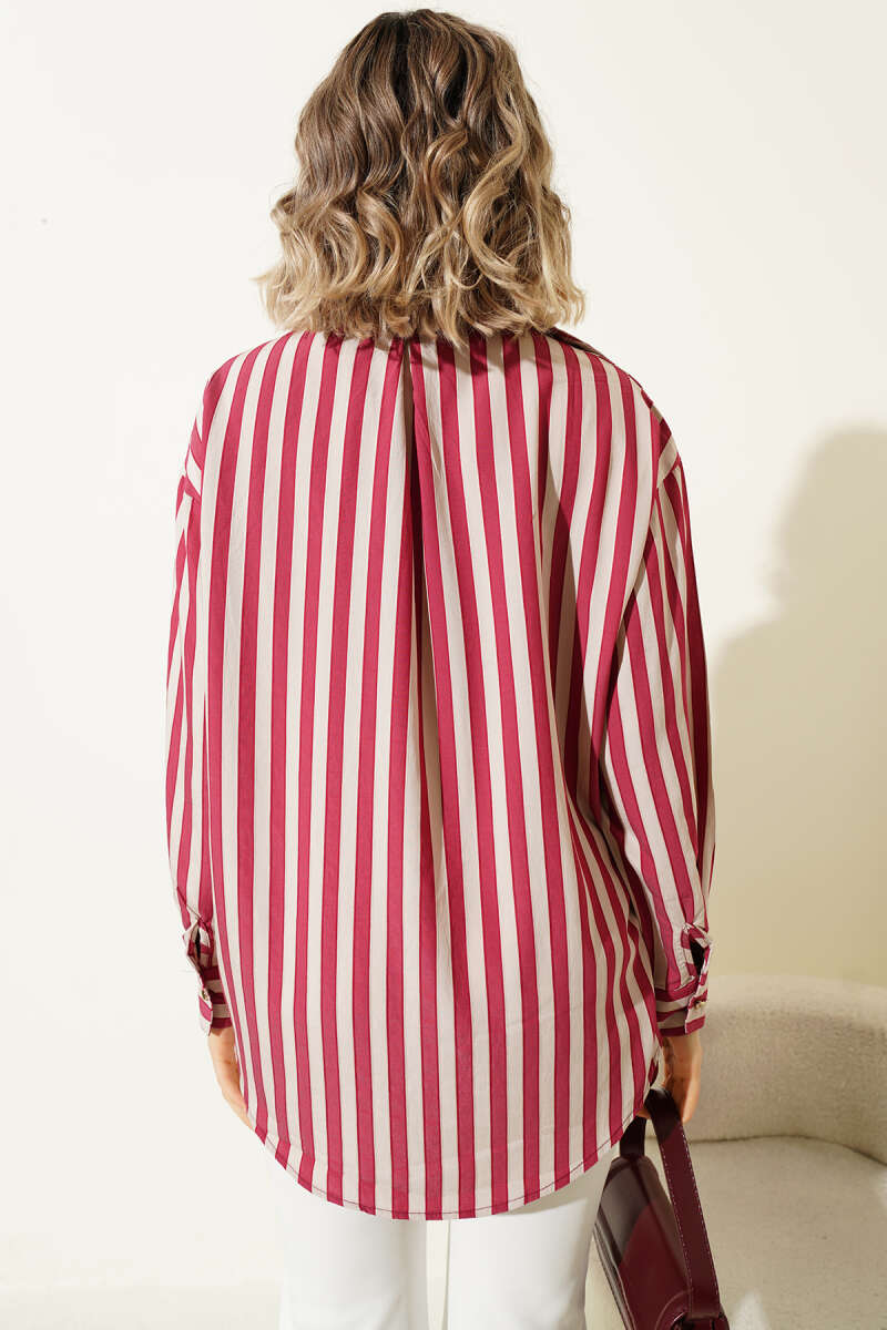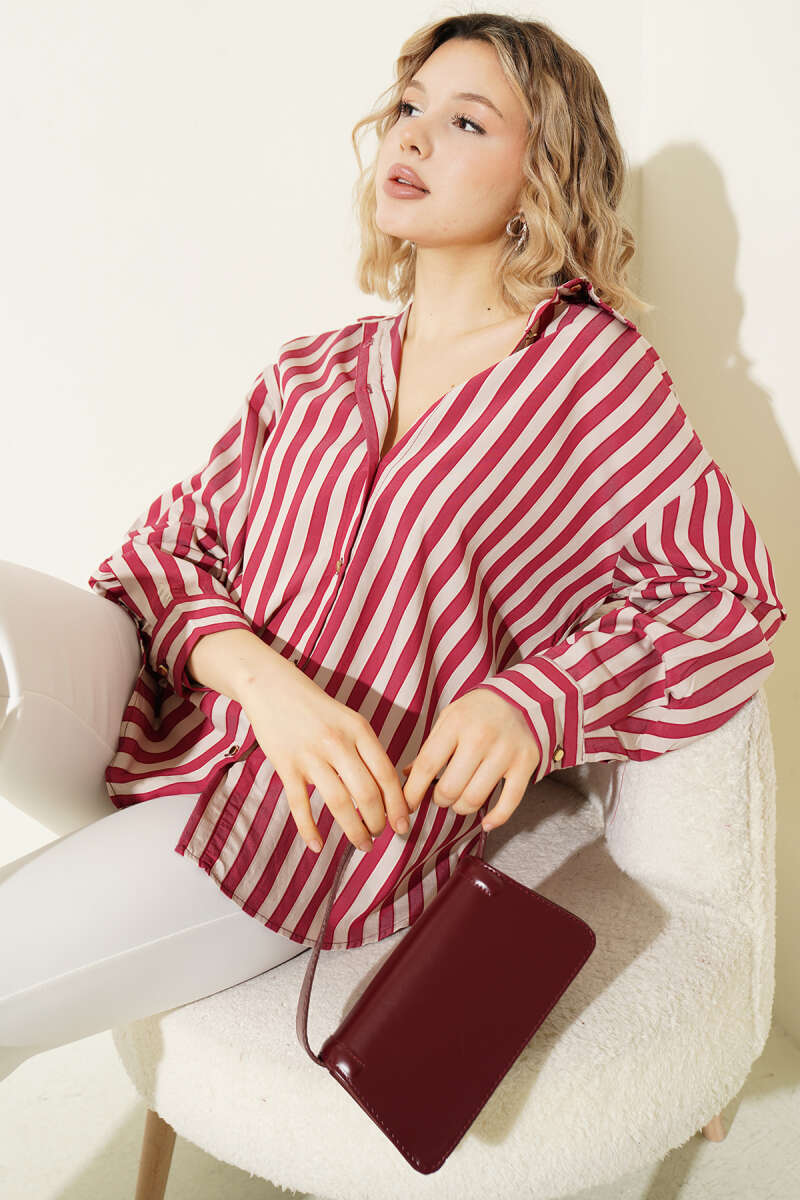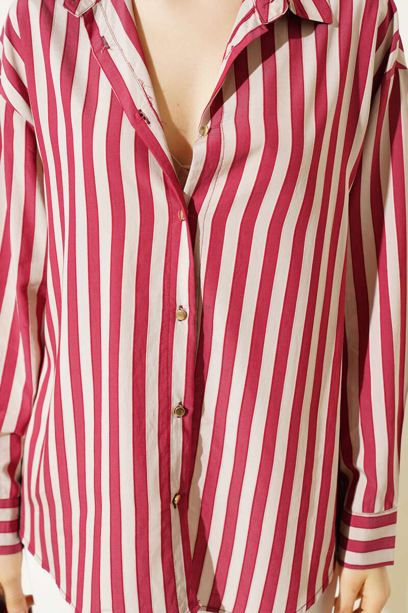 Metal Düğmeli Salaş Çizgili Gömlek Bordo