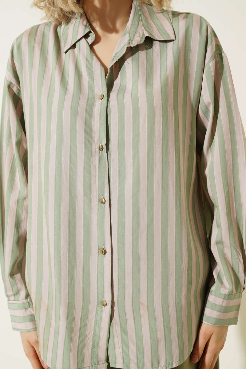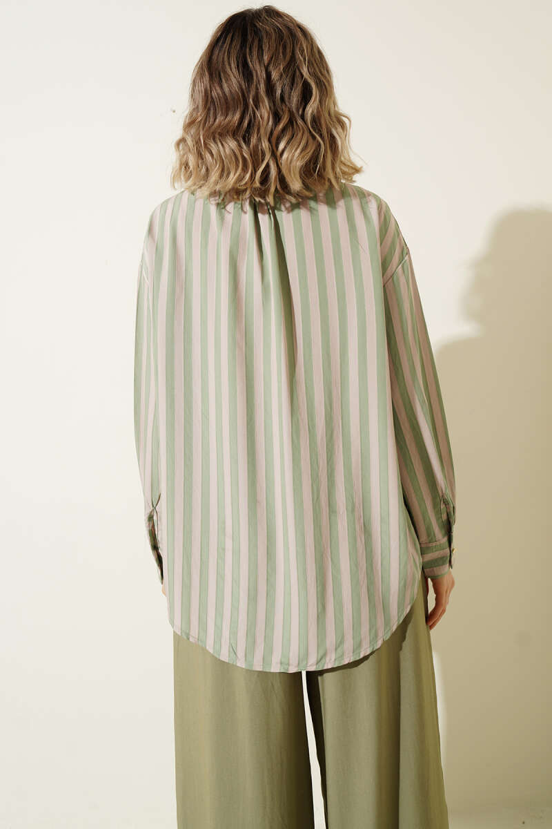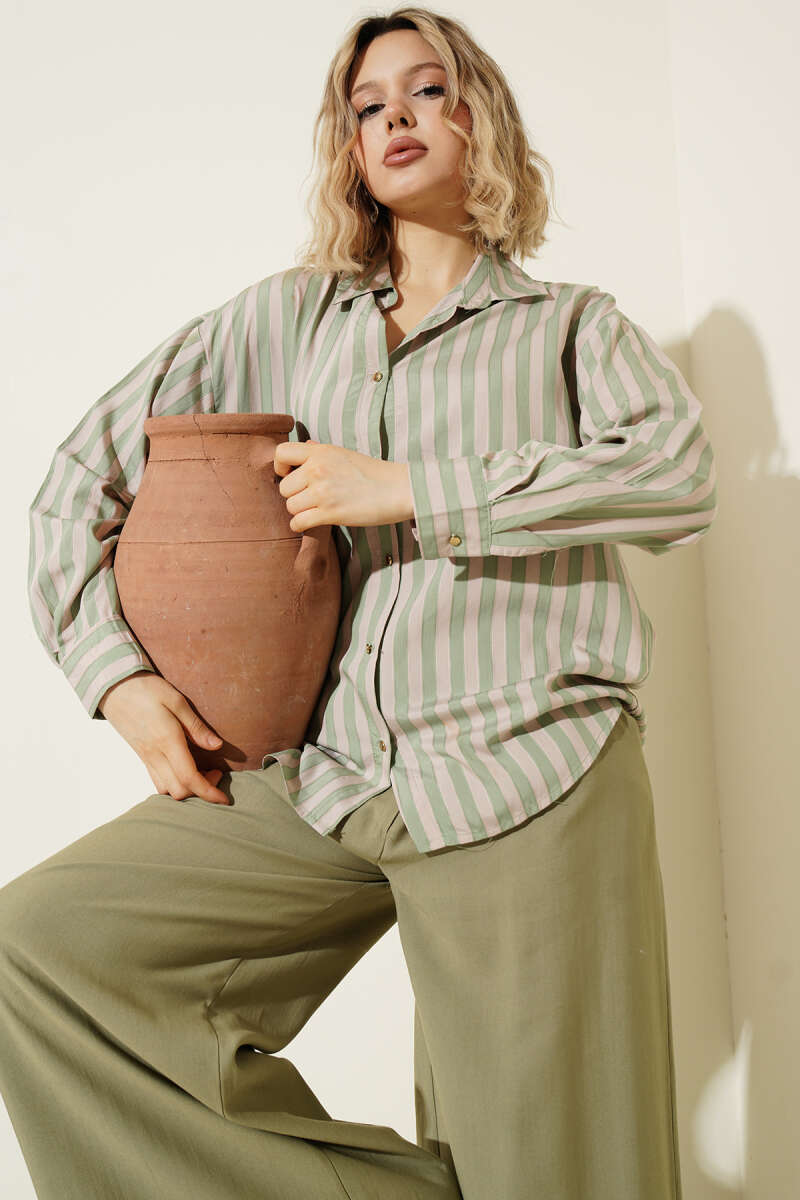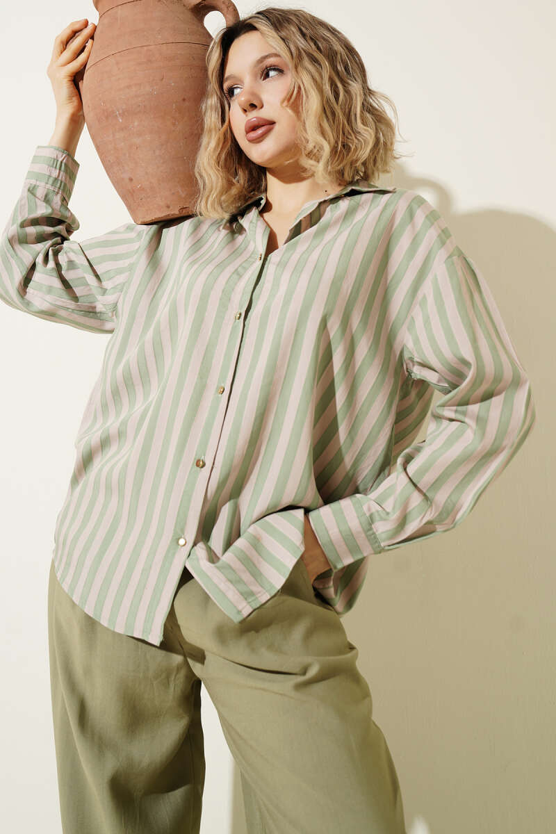 Metal Düğmeli Salaş Çizgili Gömlek Haki