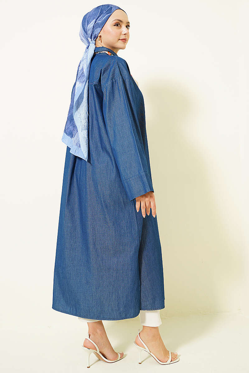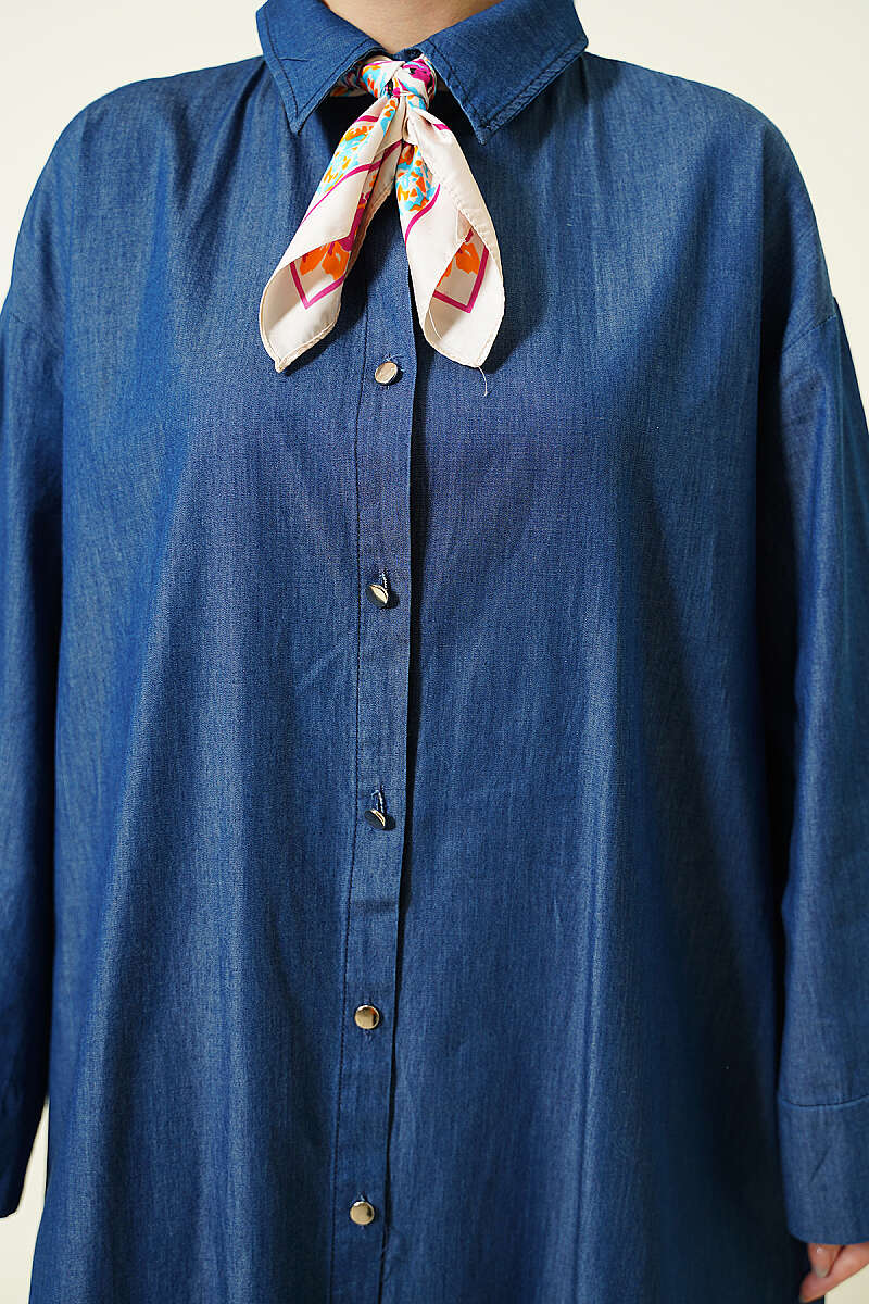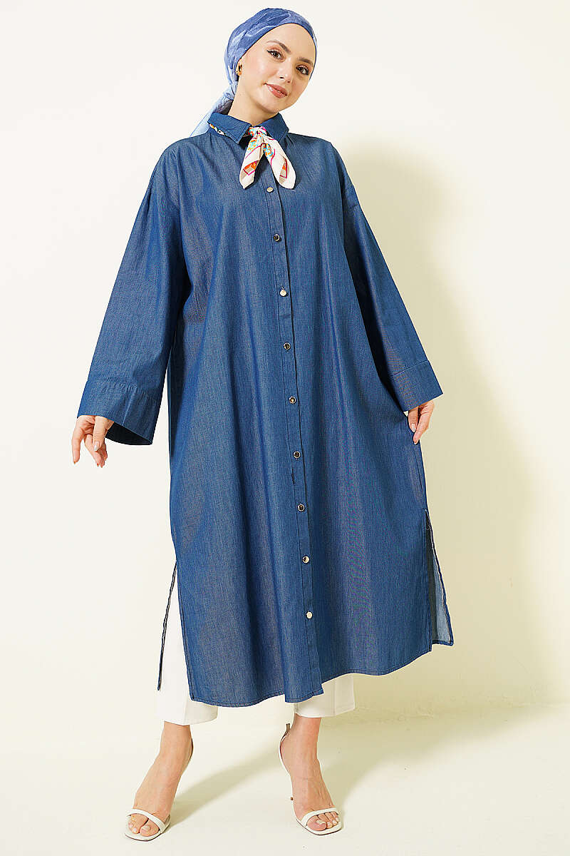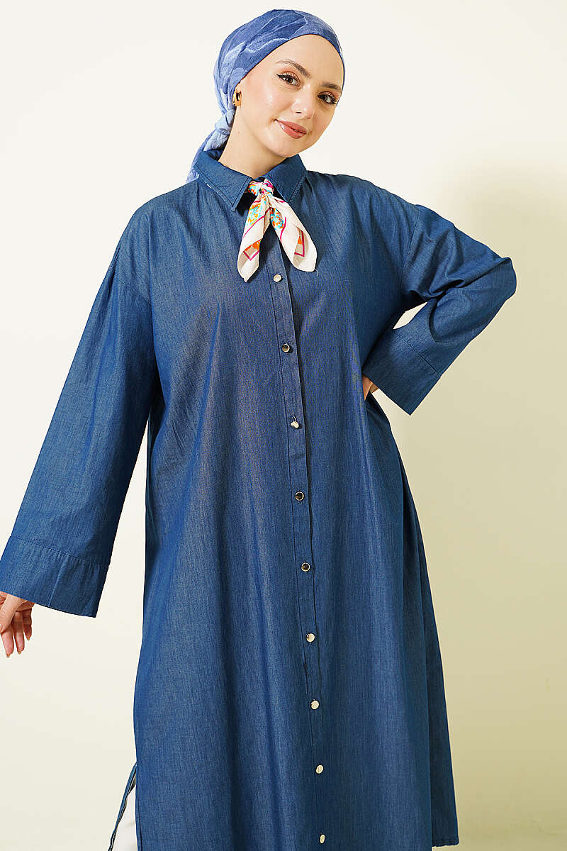 Metal Düğmeli Salaş Uzun Kot Tunik Kot Mavisi