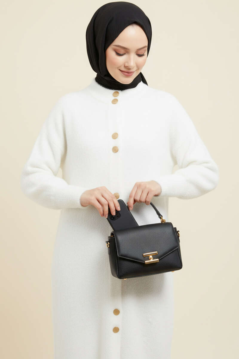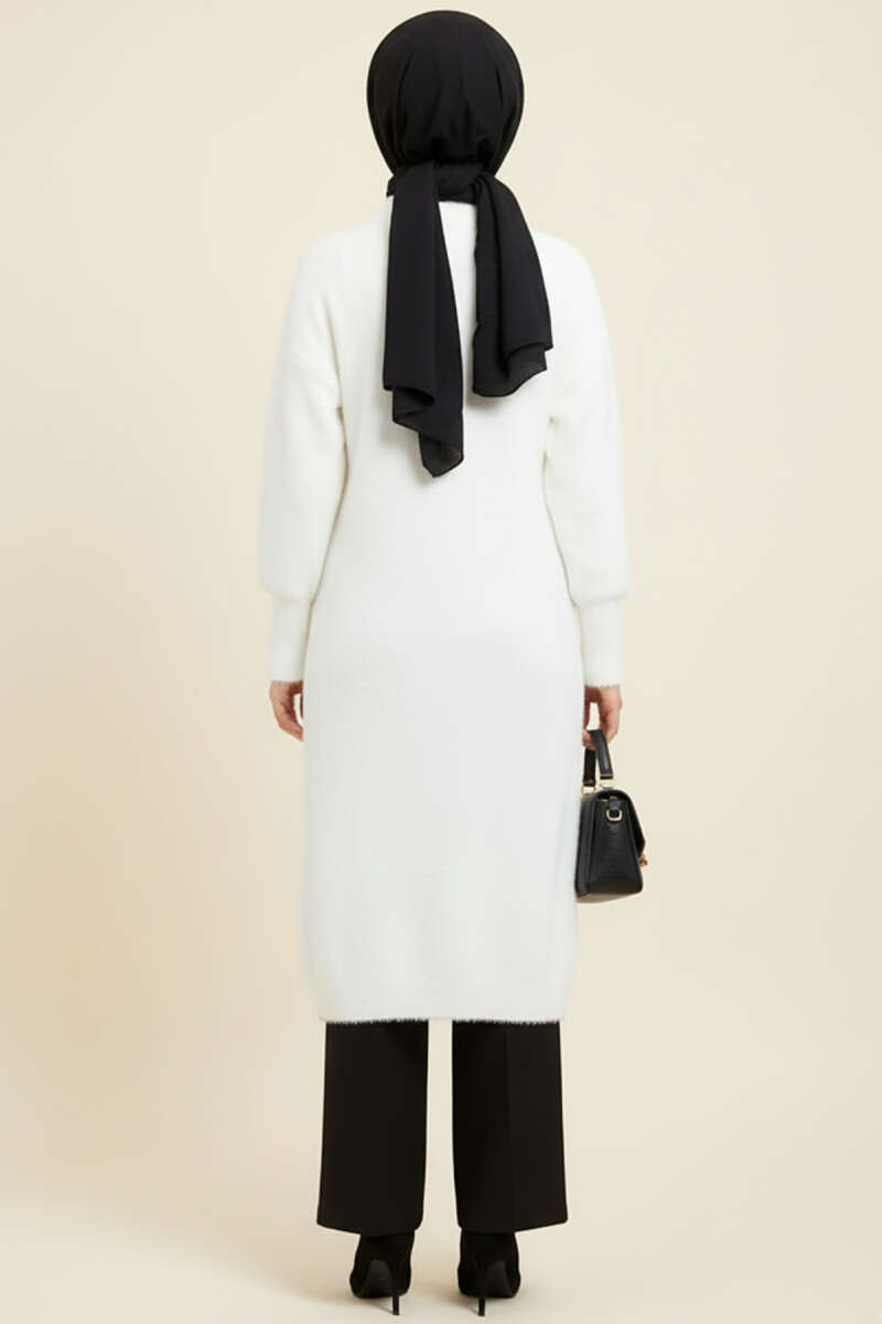 Metal Düğmeli Uzun Sakallı Hırka Beyaz