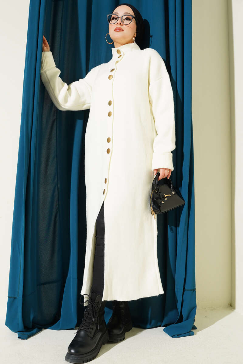 Metal Gold Düğmeli Uzun Triko Hırka Latte
