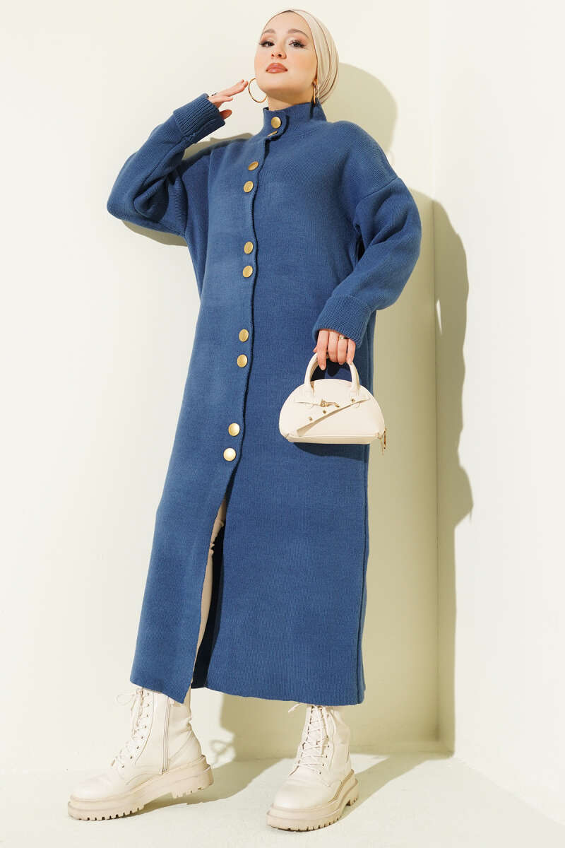 Metal Gold Düğmeli Uzun Triko Hırka Taş