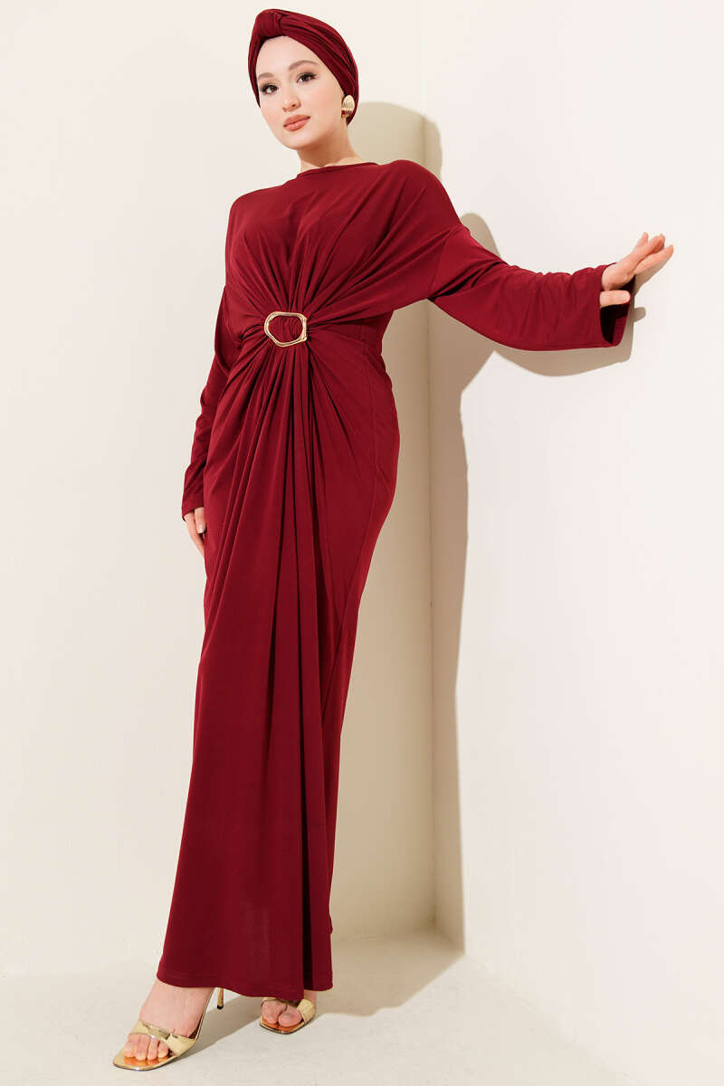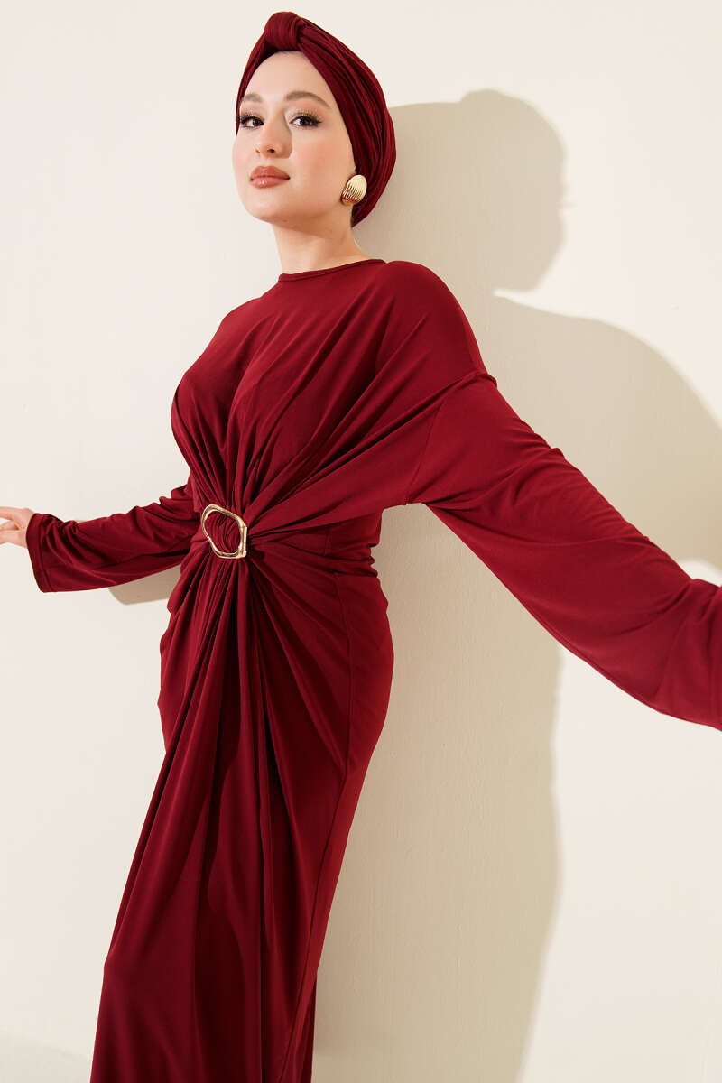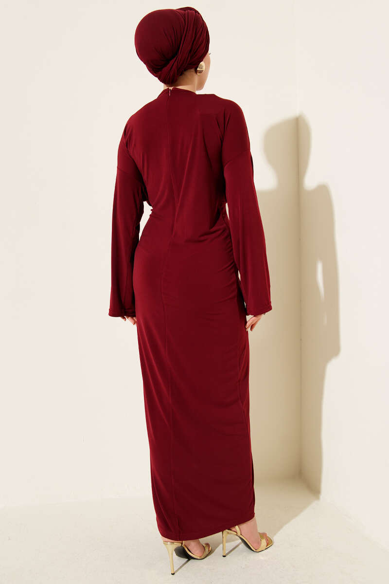 Fularlı Kemerli Saten Abiye Elbise Bordo