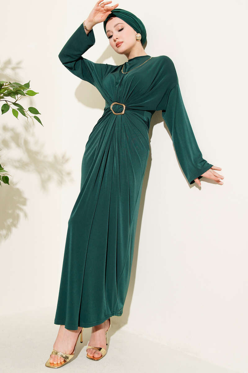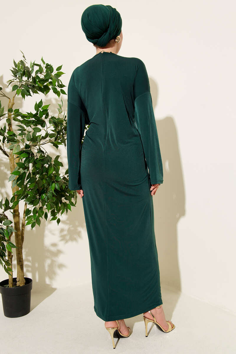 Fularlı Kemerli Saten Abiye Elbise Zümrüt