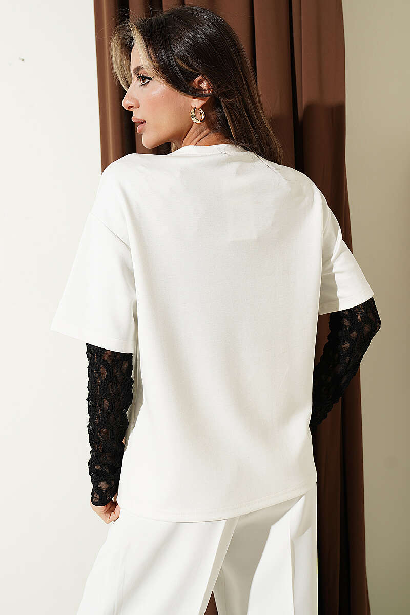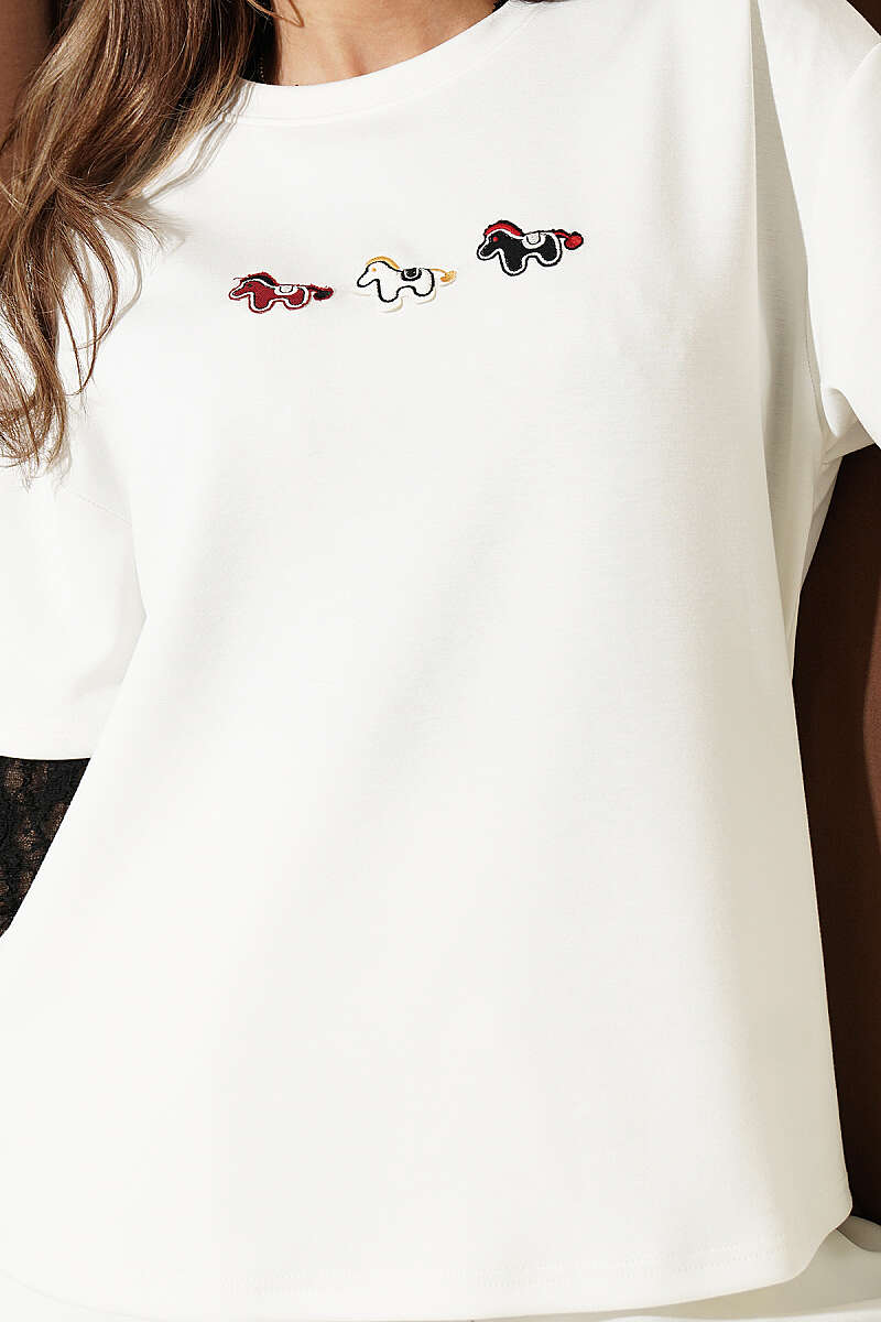 Midilli Nakışlı Modal T-shirt Ekru