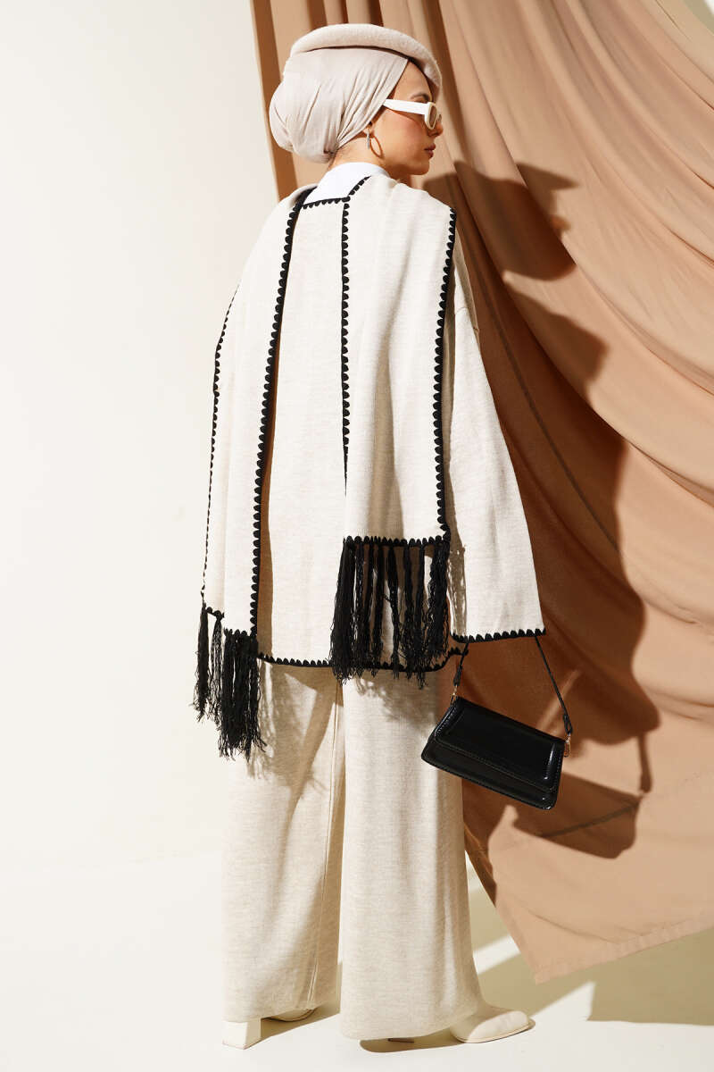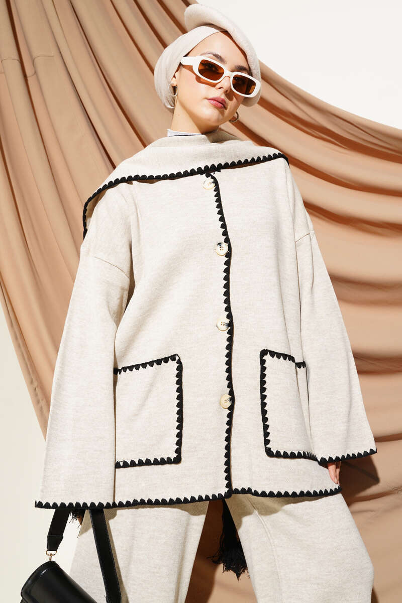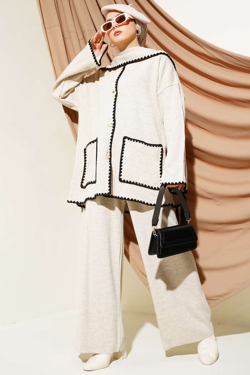 Balıkçı Yaka Fitilli Triko İkili Takım Ekru