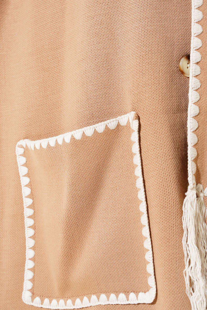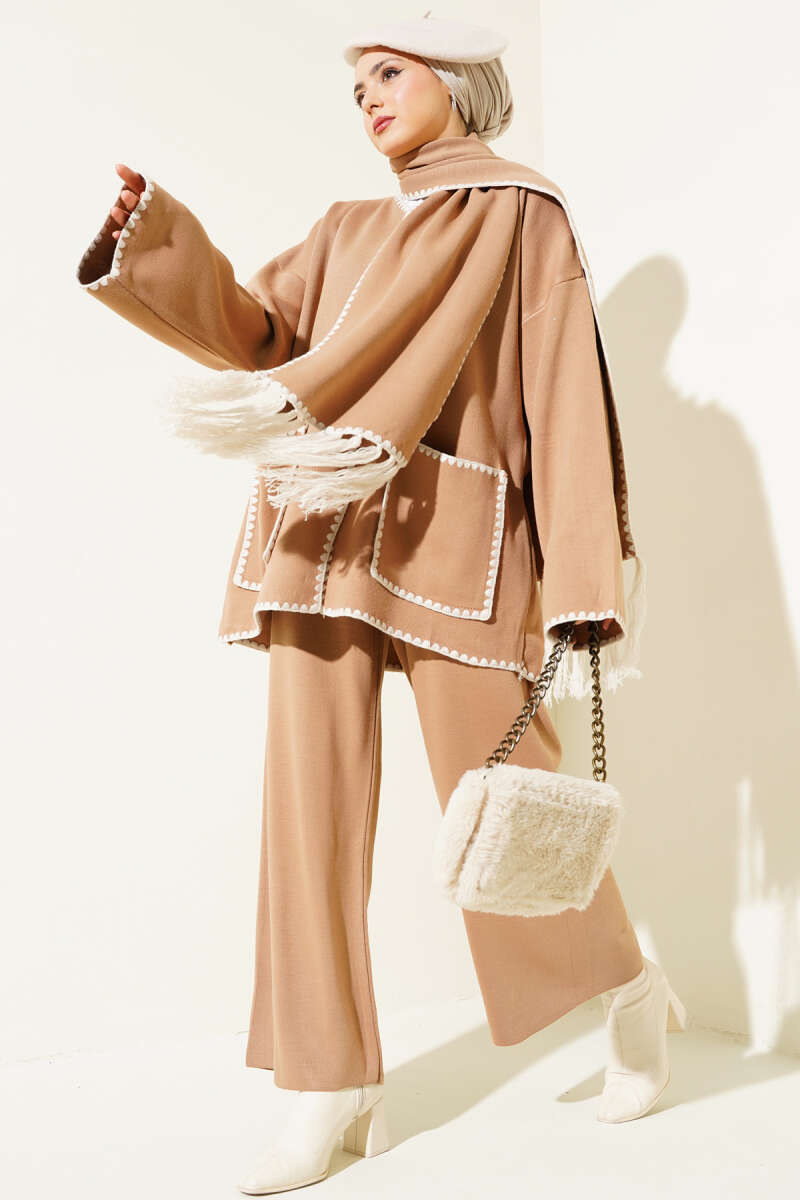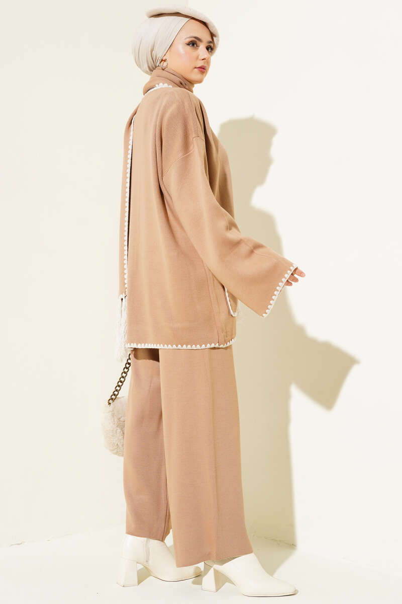 Taşlı Baklava Desen Triko İkili Takım Bej