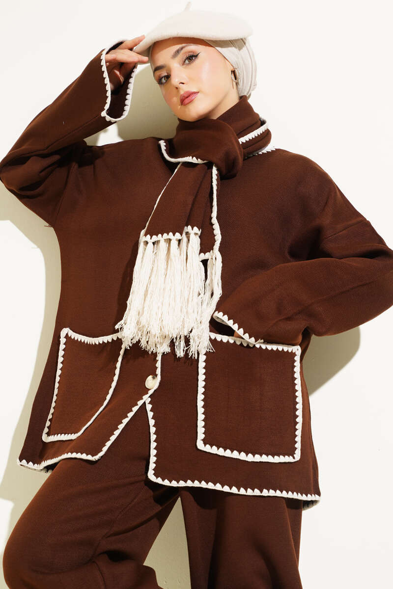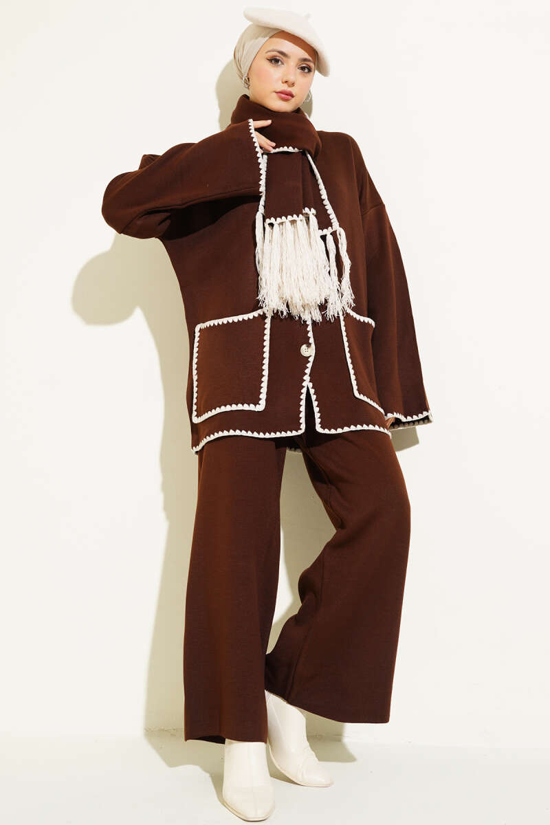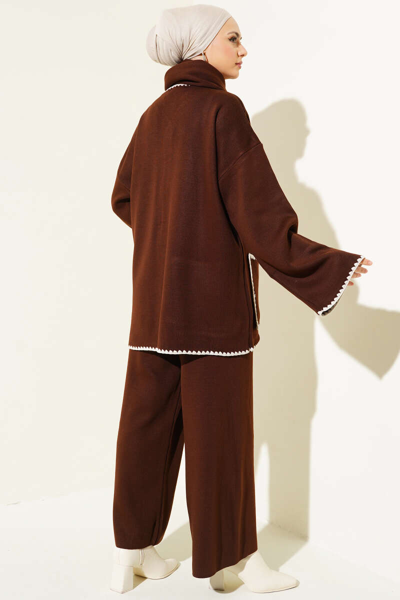 Balon Kol Balıkçı Yaka Triko İkili Takım Kahve