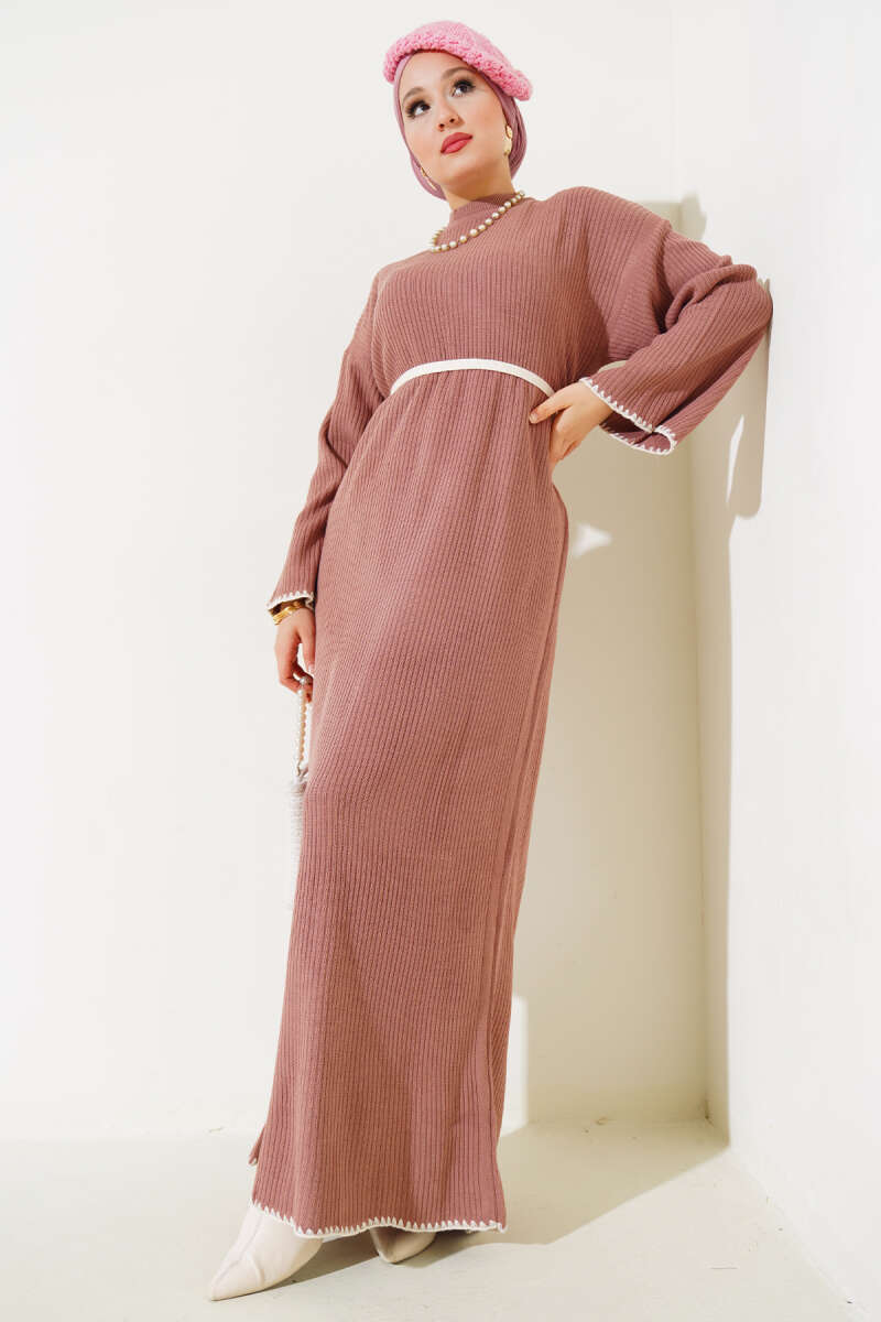 Yakası Yarım Fermuarlı Triko Elbise Taş
