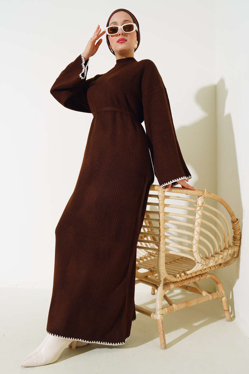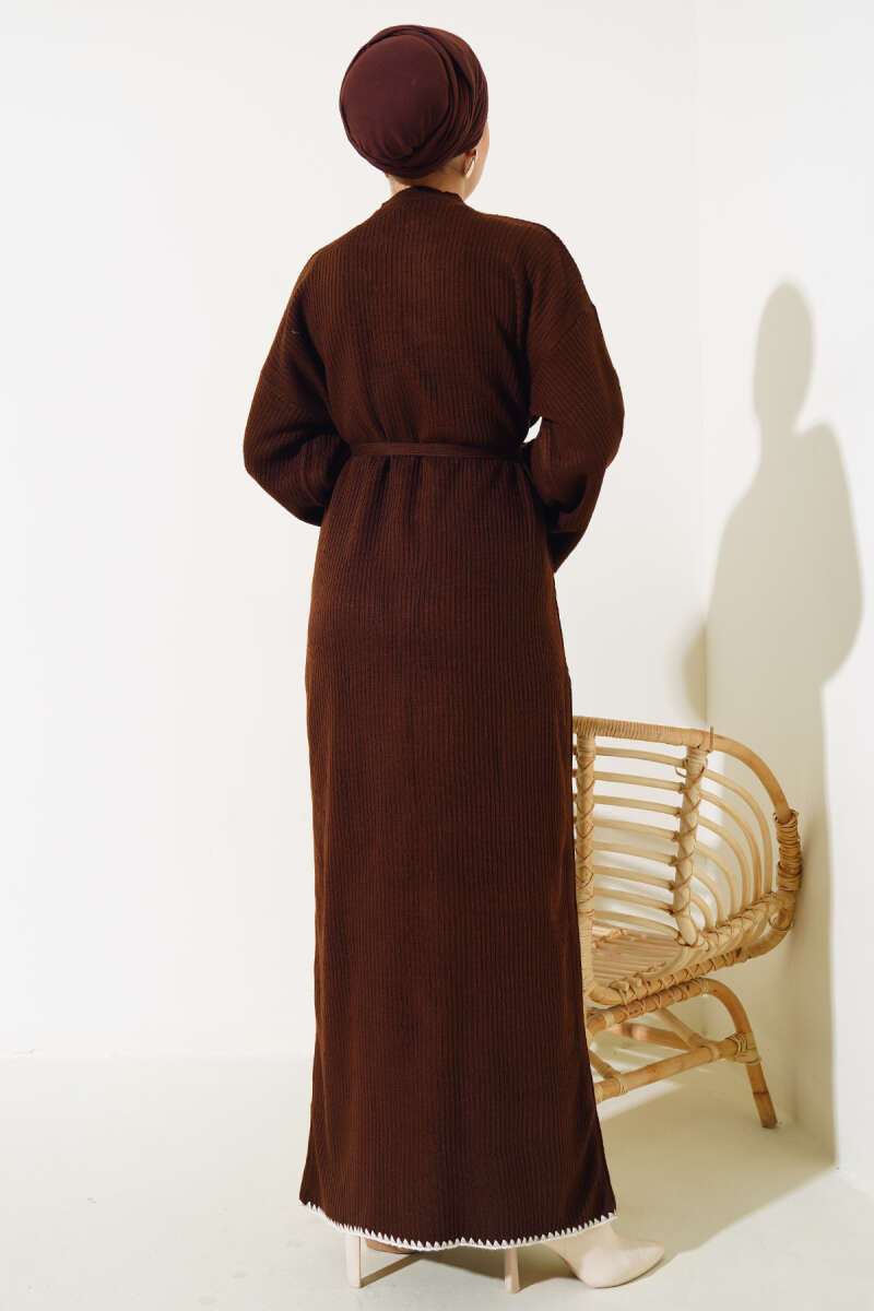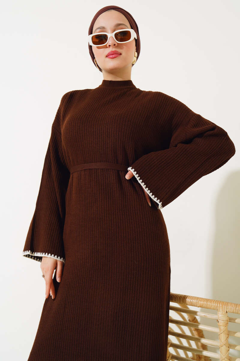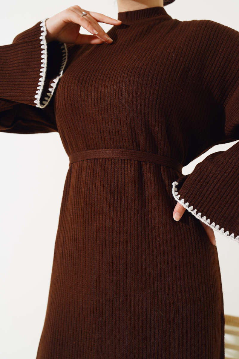 Yarım Düğmeli Balon Kol Kemerli Elbise Kahve