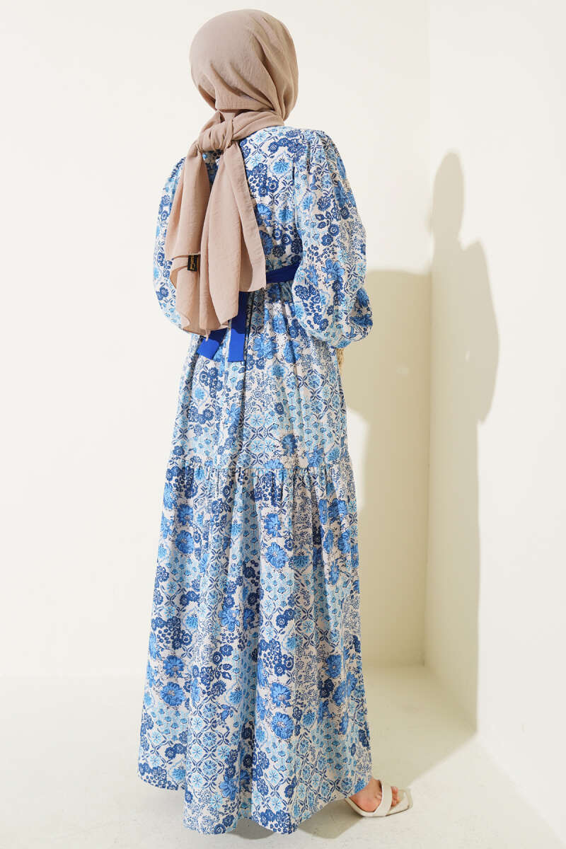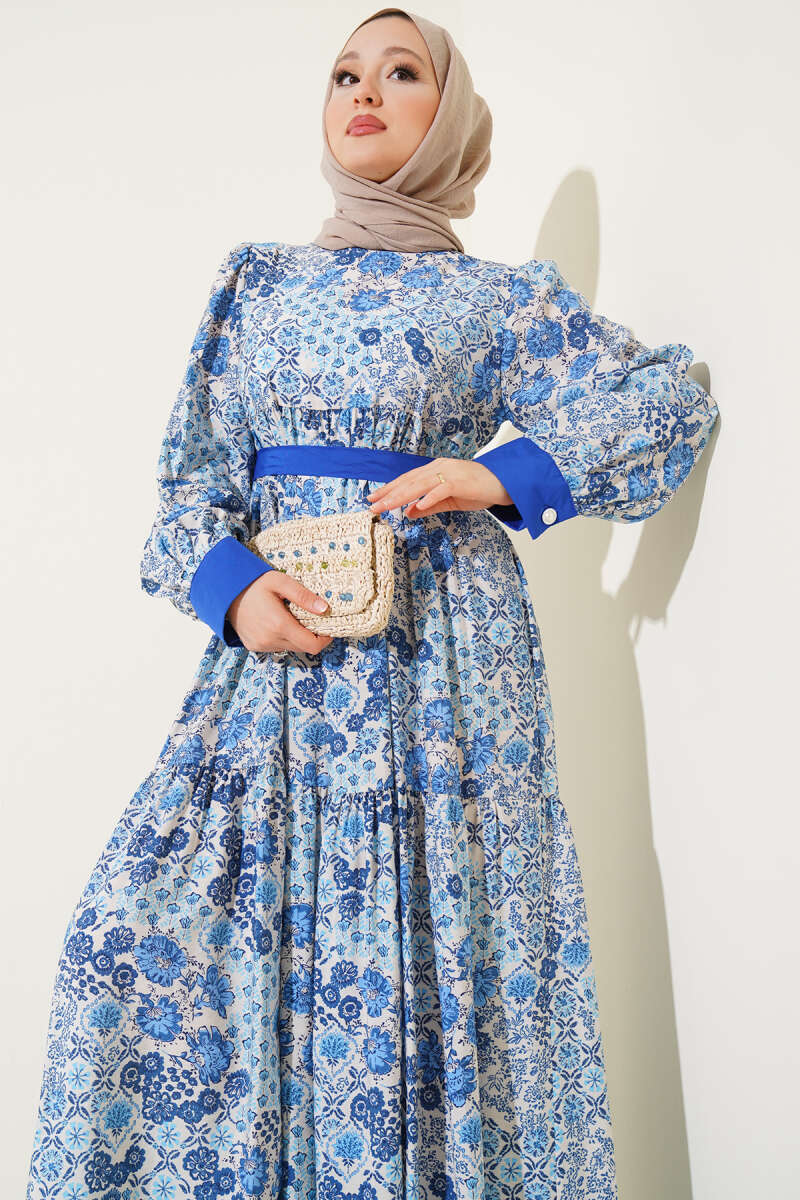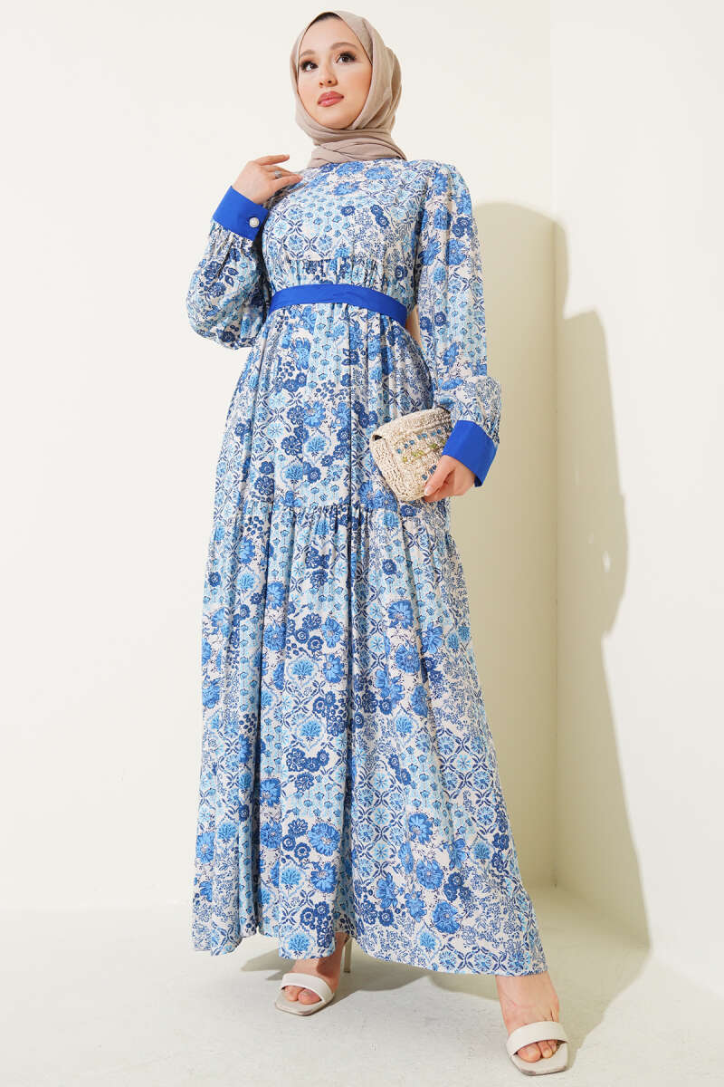 Mini Çiçek Desenli Elbise Saks