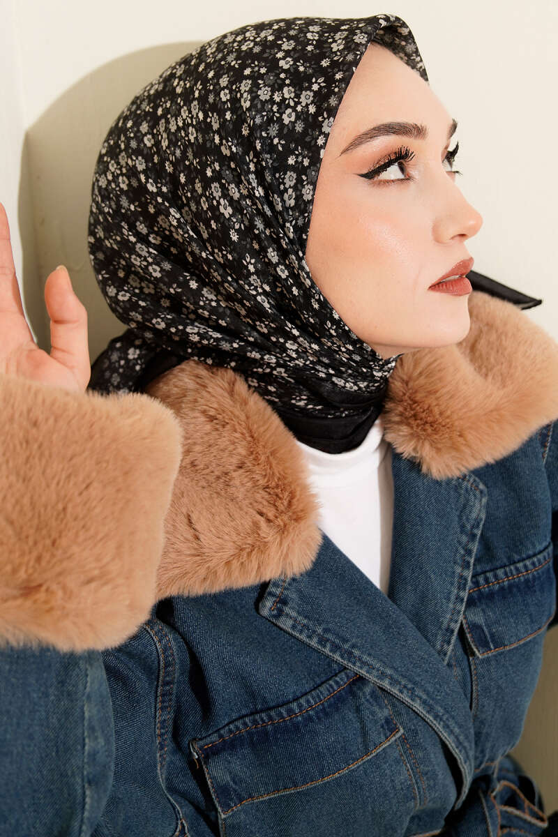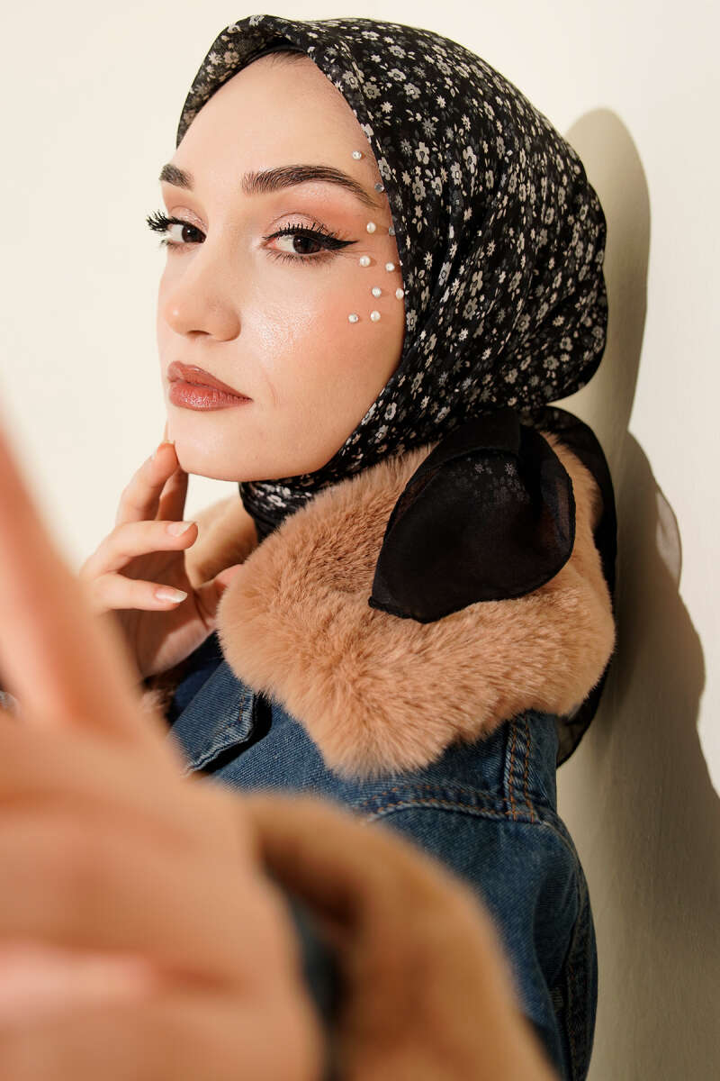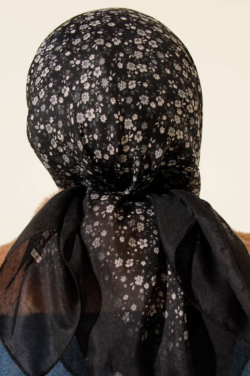 Mini Çiçek Desenli Eşarp Siyah Füme