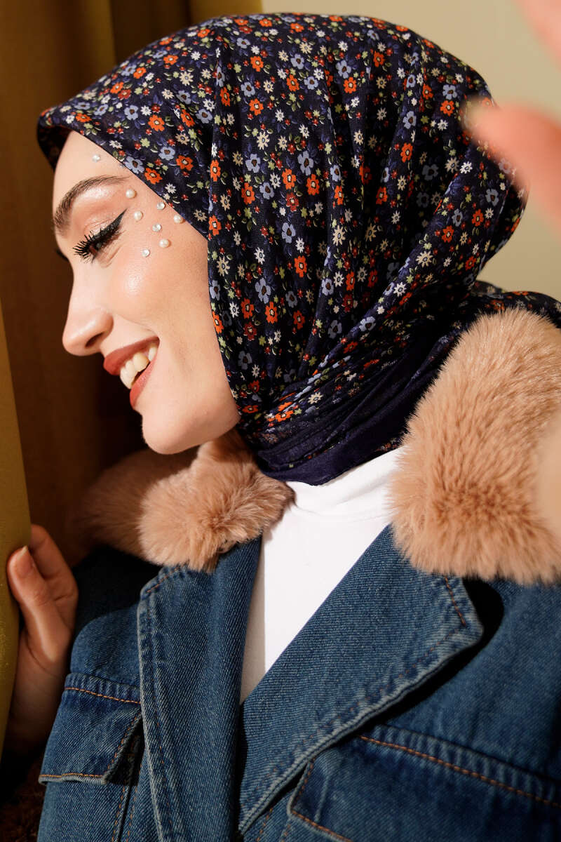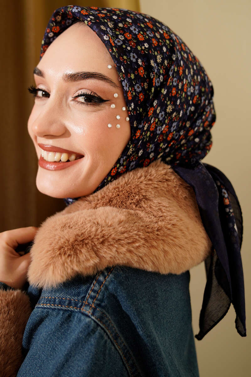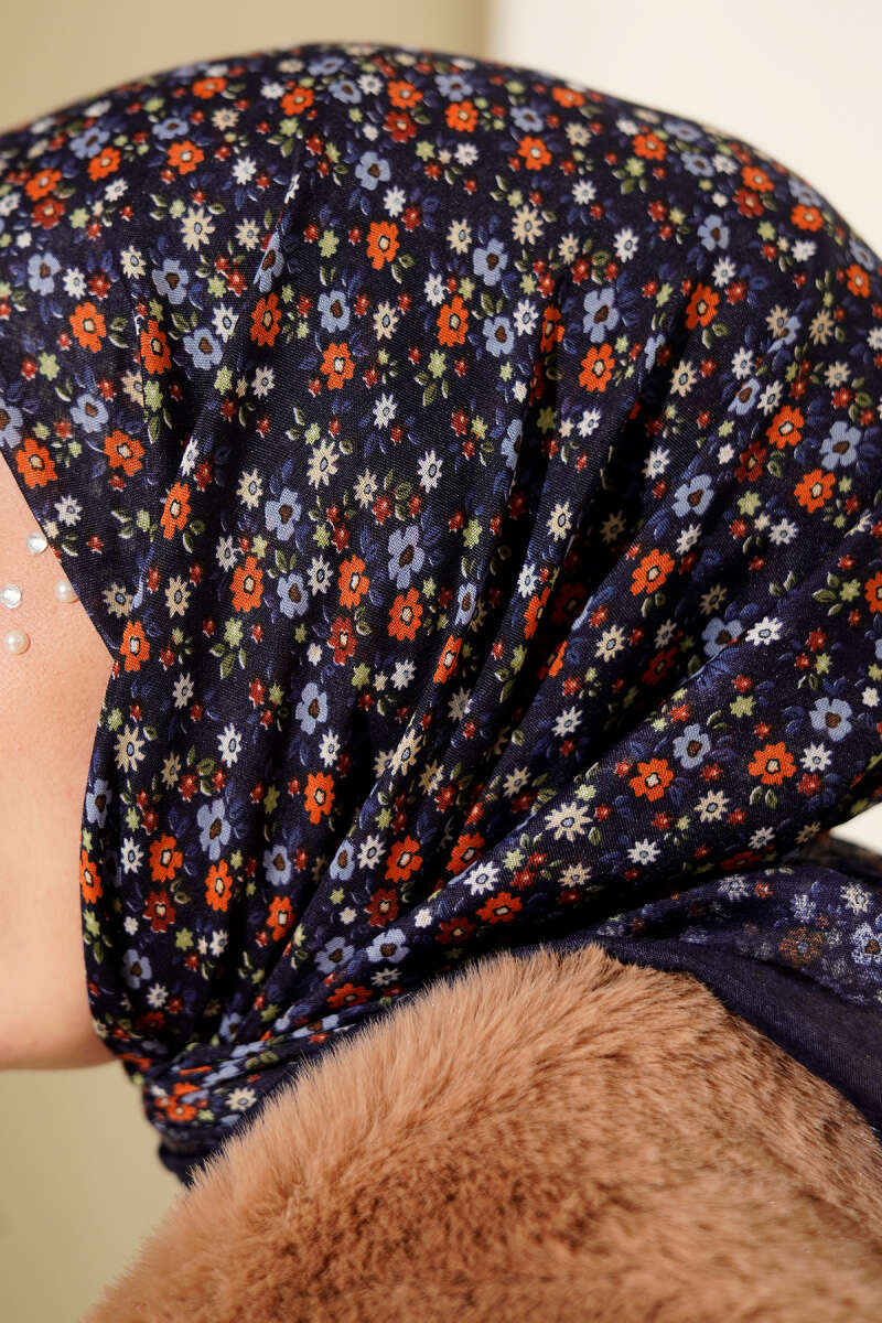 Mini Çiçek Desenli Eşarp Lacivert Mavi