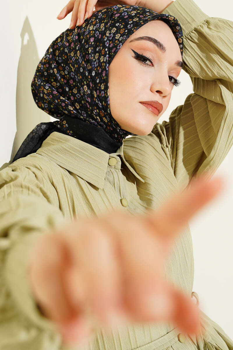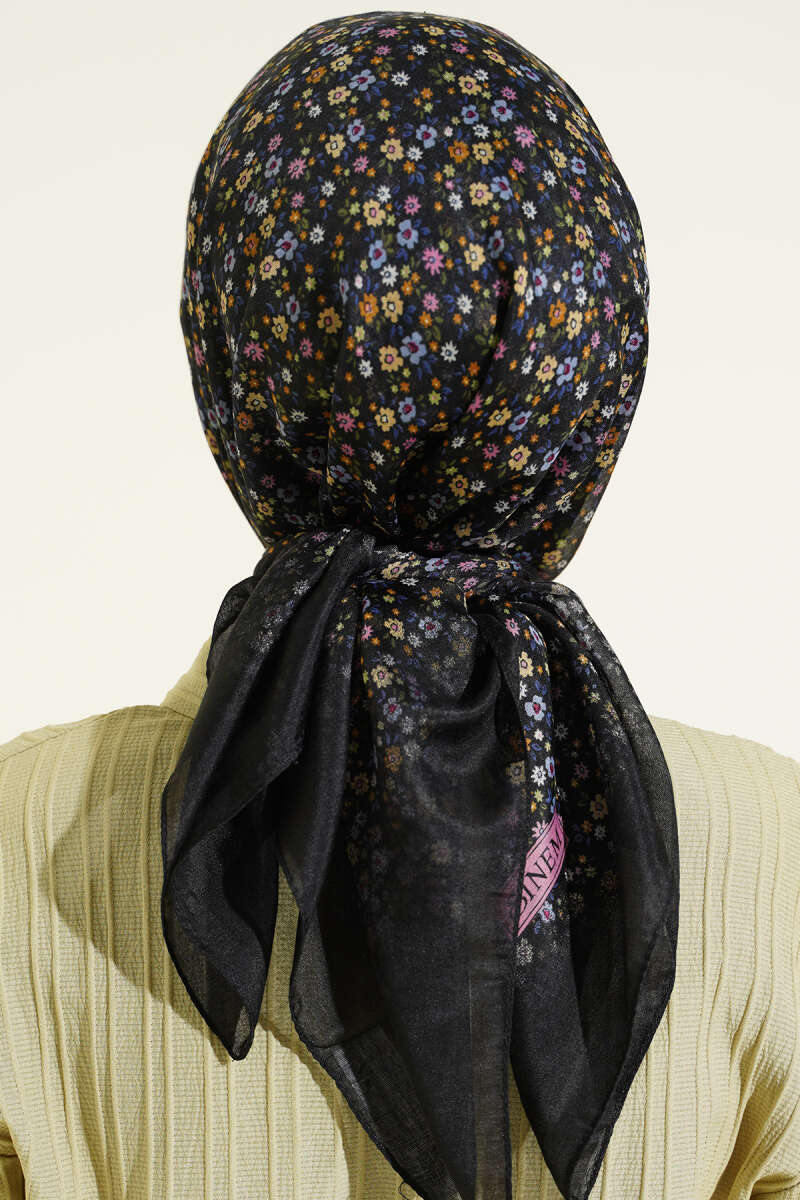 Mini Çiçek Detaylı Eşarp Siyah Pembe