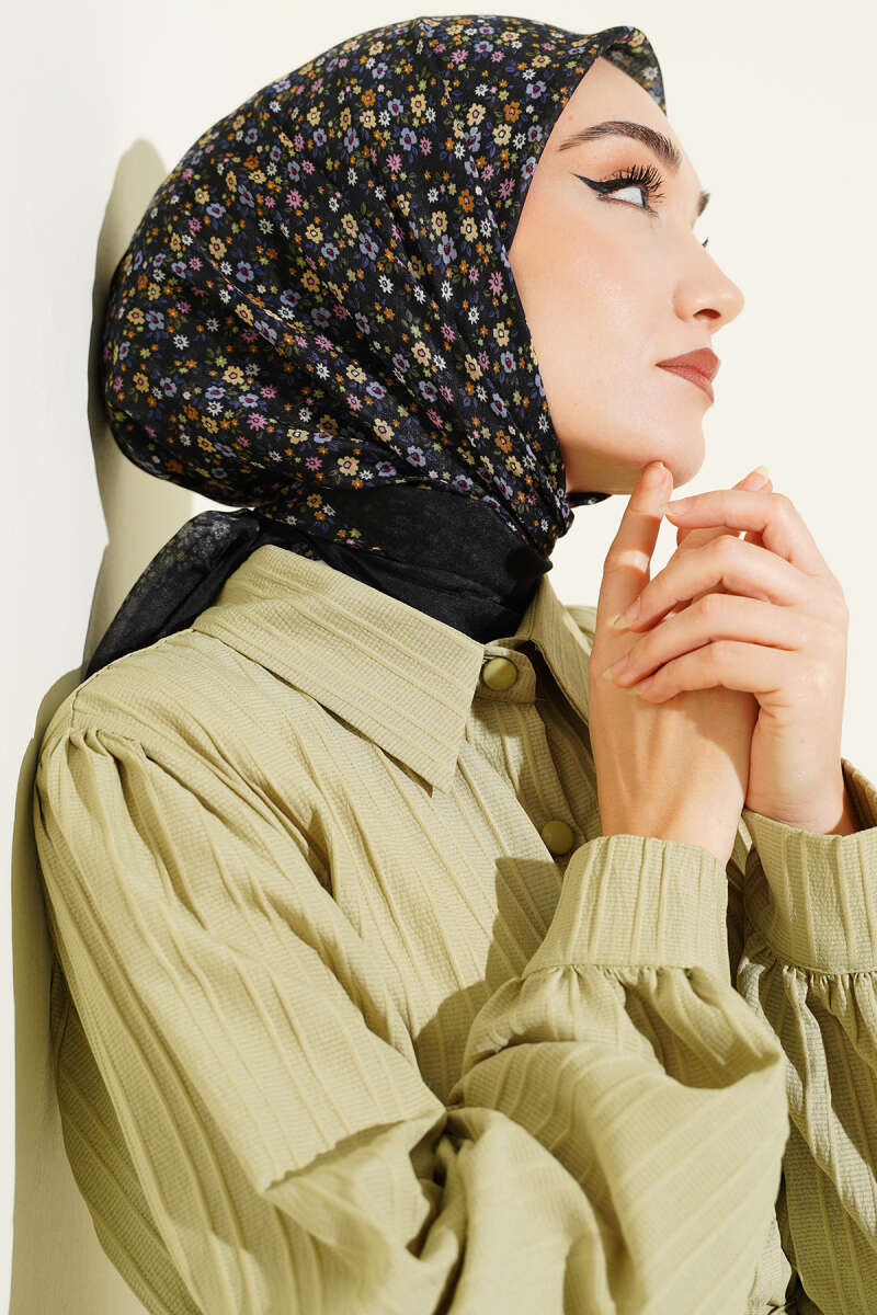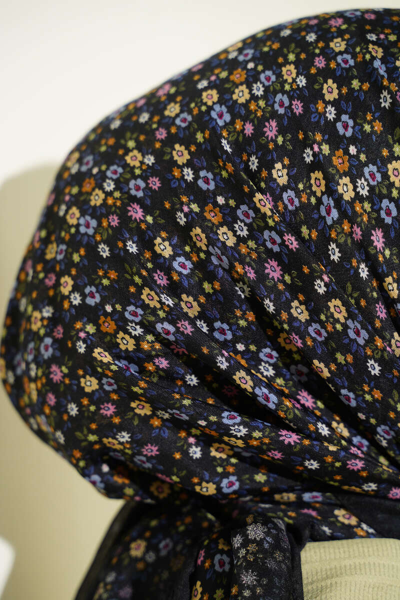 Mini Çiçek Detaylı Eşarp Siyah Mavi