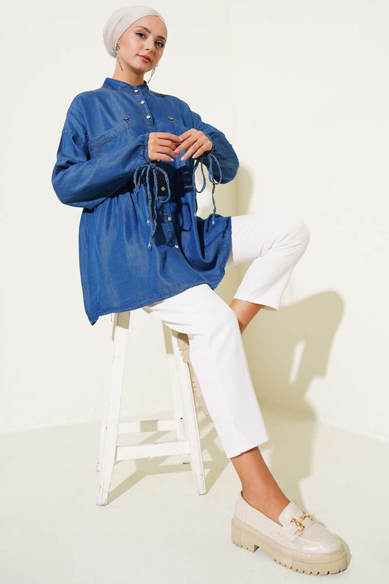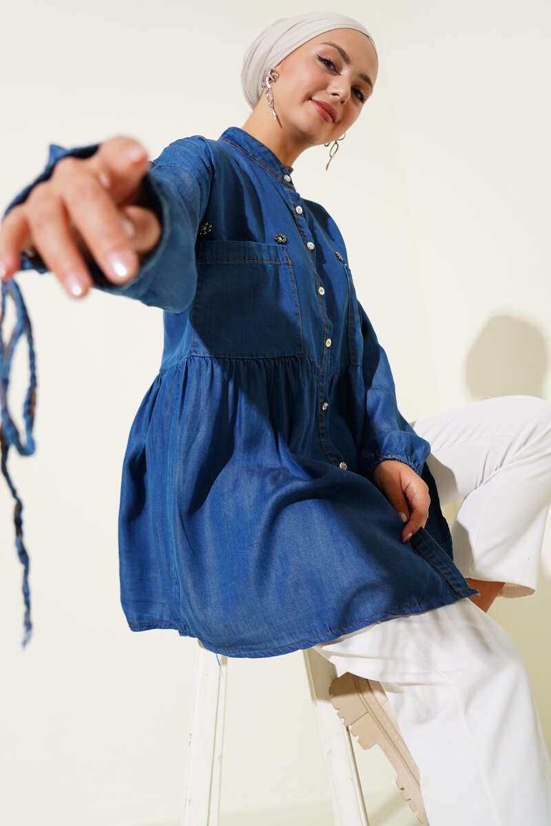 Mini Çiçekli Göğüs Cepli Kot Gömlek Koyu Mavi