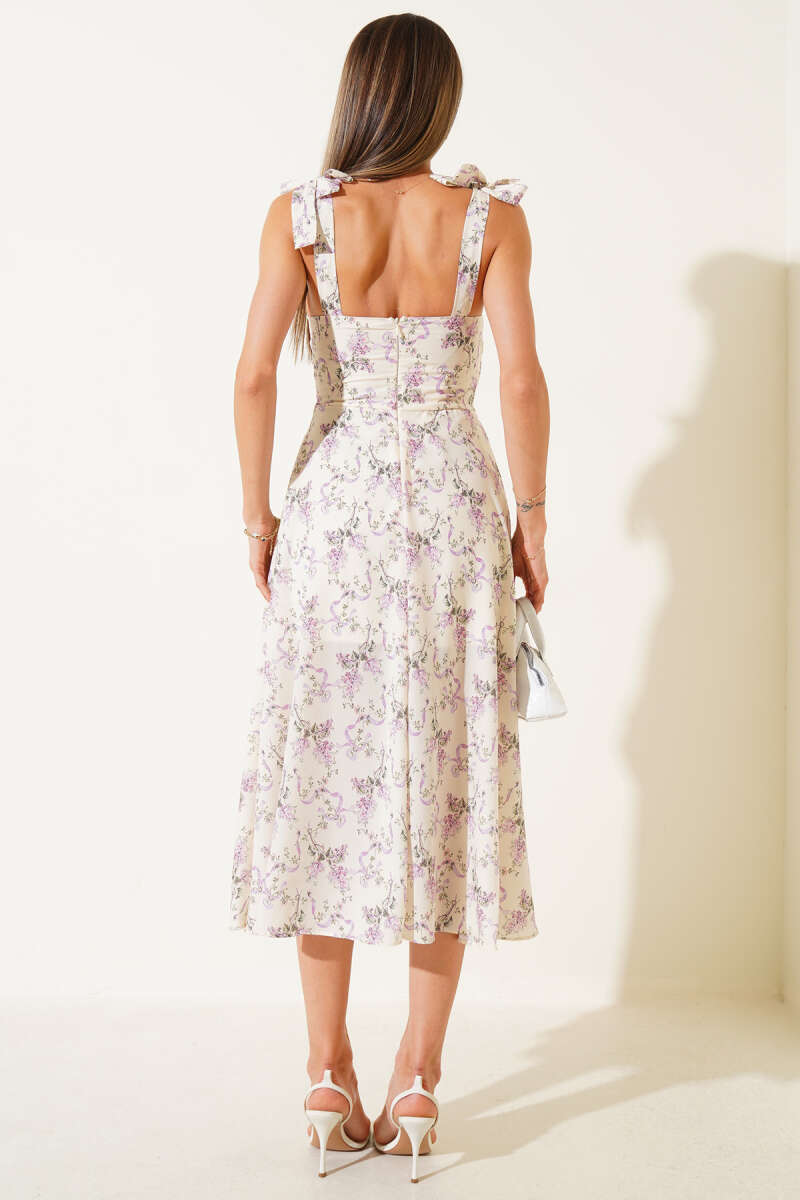 Mini Çiçekli Omuz Bağlamalı Midi Elbise Sarı