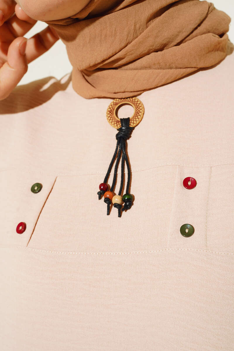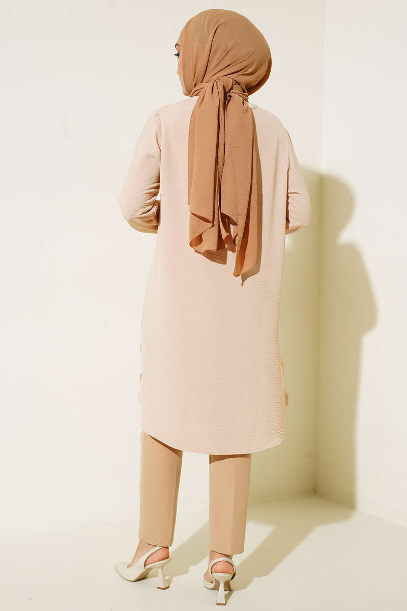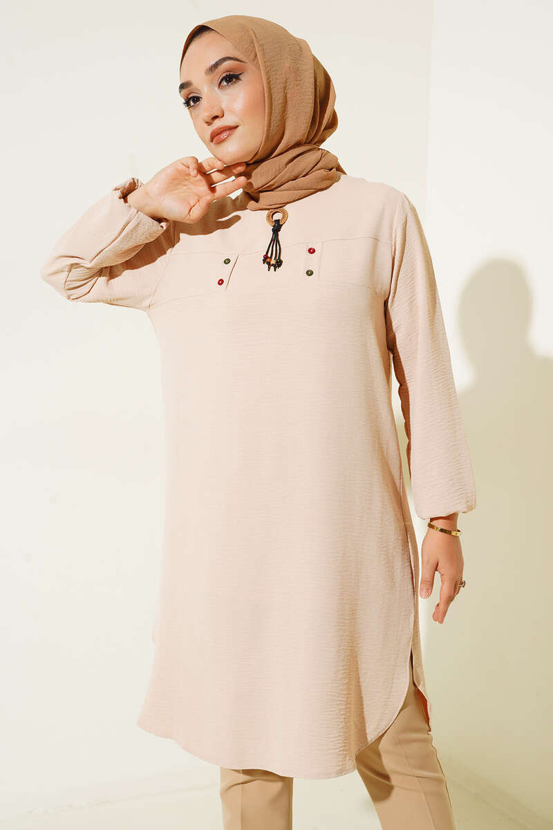Yeni sezon tuniğimiz salaş kesimlidir. Etek uçları yırtmaç detaylı olan tuniğmizin bilkeleri lastiklidir. Ense düğmesi vardır. Göğsünde bulunan mini düğmeleri tuniğimize detay kazandırmıştır. Yakası süslemelidir.