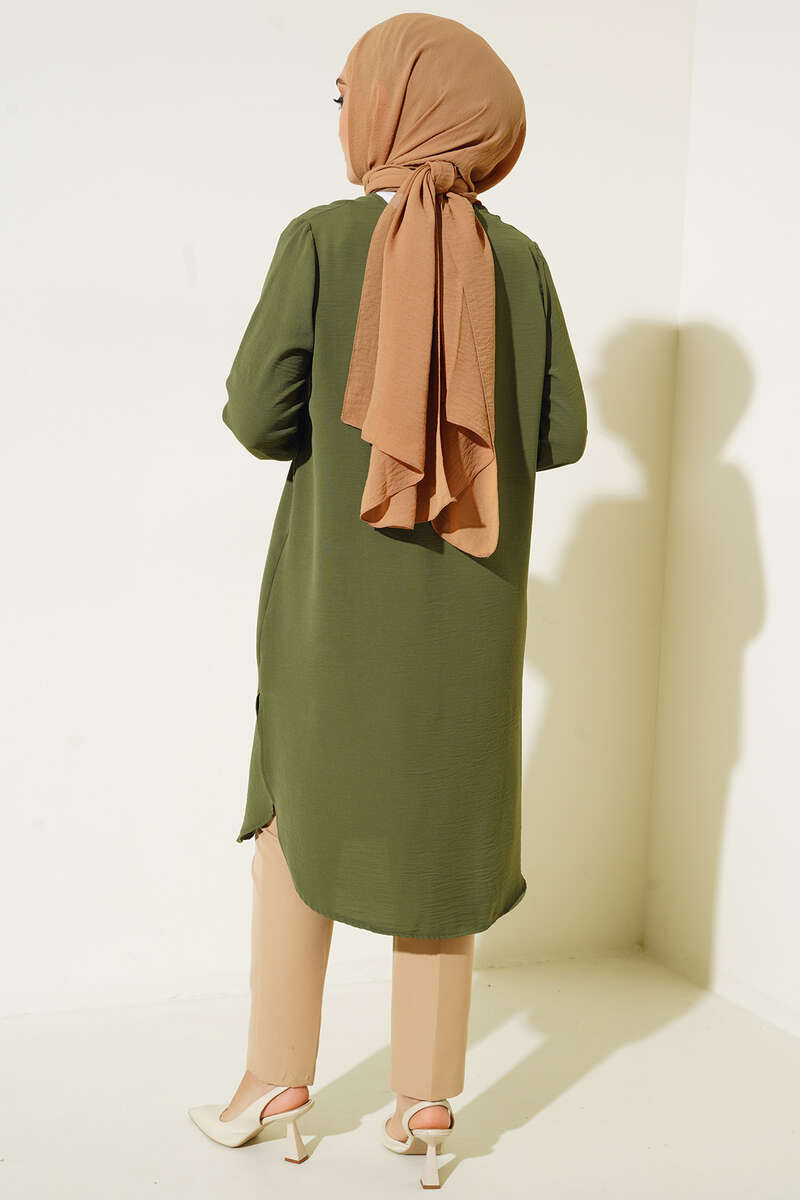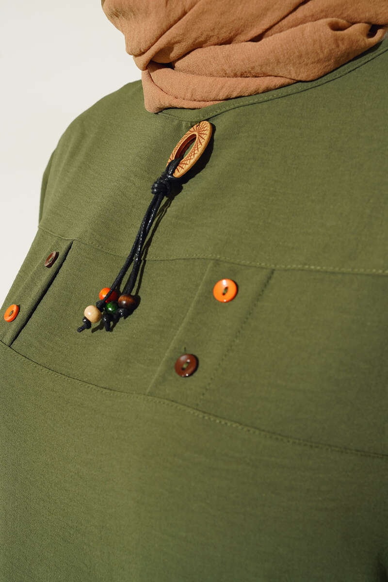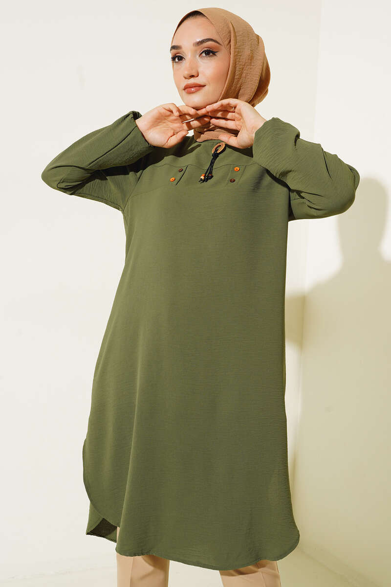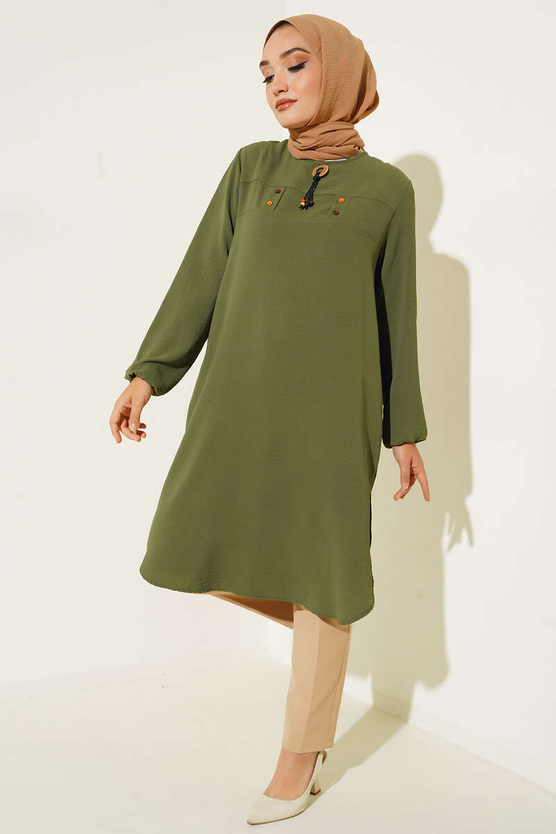 Yeni sezon tuniğimiz salaş kesimlidir. Etek uçları yırtmaç detaylı olan tuniğmizin bilkeleri lastiklidir. Ense düğmesi vardır. Göğsünde bulunan mini düğmeleri tuniğimize detay kazandırmıştır. Yakası süslemelidir.